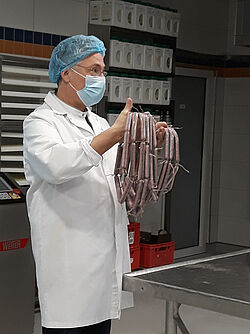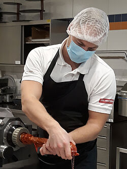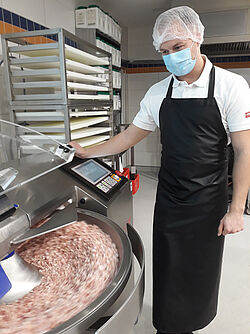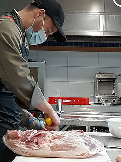 Die Studierenden führten dort fast wie gewohnt ihre praktischen Übungen zur Herstellung von Brüh- und Rohwurst durch. Dabei konnten sie nicht nur auf die fachkundige Anleitung der Dozenten Brauer und Häußler bauen, erstmals unterstützte ein Fleischsommelier die Veranstaltung: der Weiterstädter Dozent und Metzgermeister Jannis Kullmann. Er demonstrierte den Studierenden das Zerlegen einer Schweinekeule, Ausgangsmaterial zur Herstellung von Brühwurst, sowie die Zubereitung und Abfüllung der Rohwürste.