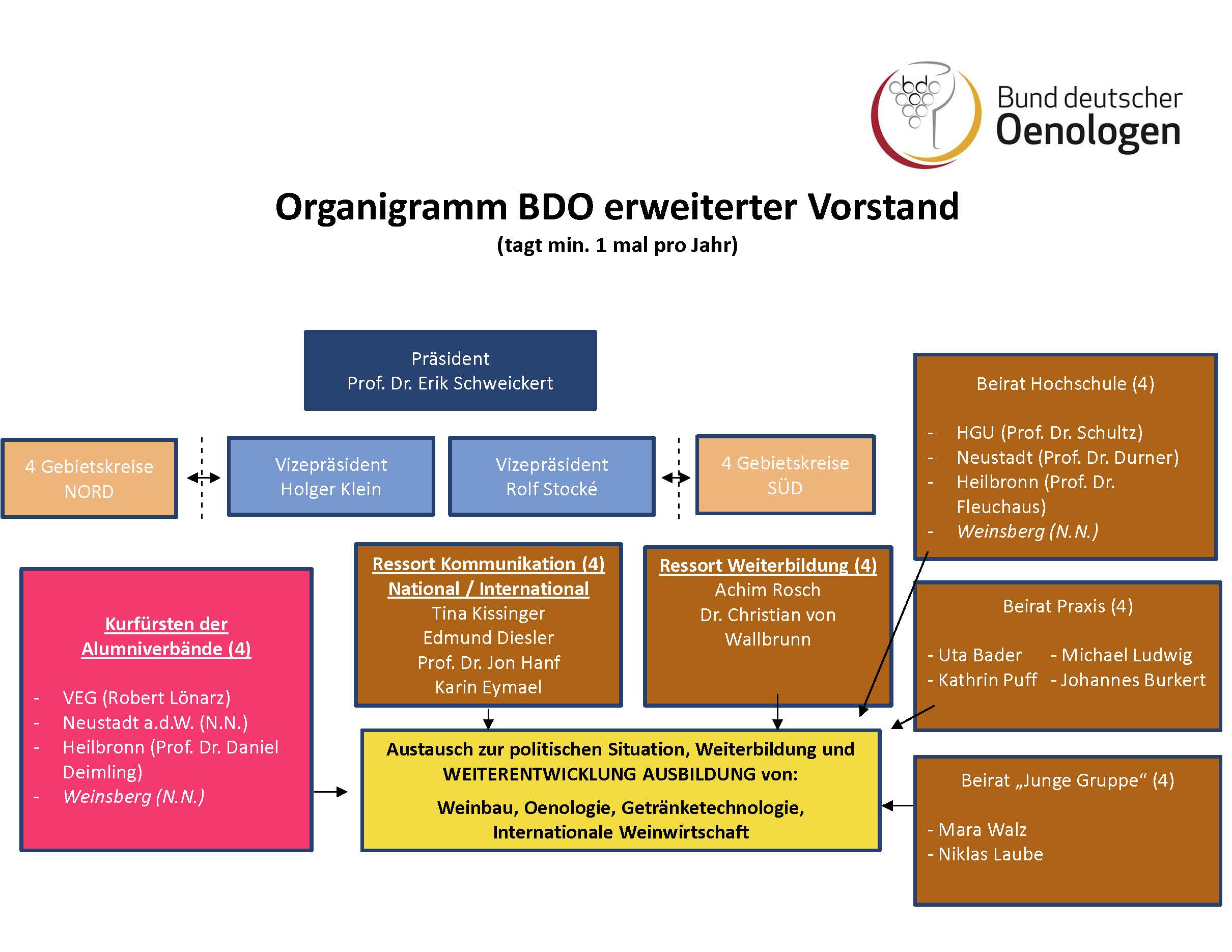 Schweickert gibt weiterhin das Ziel aus, den BDO auszurichten, dass er ein Bund aller deutschen Oenologinnen und Oenologen ist. Insbesondere in den momentan schwierigen Zeiten durch die Änderung der Regulierung der Weinwirtschaft bedürfe es unbedingt eine Einigkeit der deutschen Oenologen.