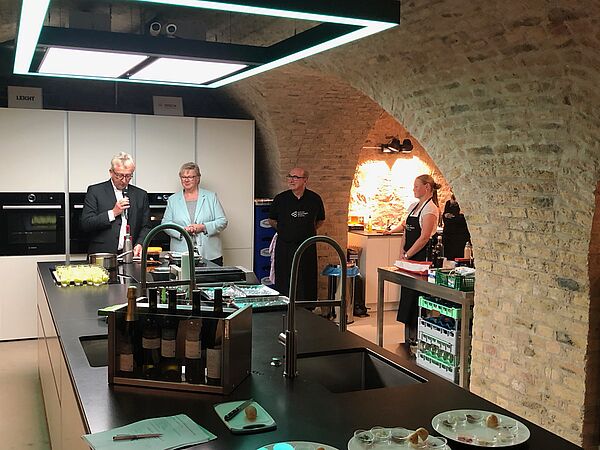 Dass die Theorie auch hervorragend in die Praxis umgesetzt werden konnte, dafür sorgte Harry de Schepper. Als gelernter und leidenschaftlicher Gastronom verwandelte er schlichte Melonen in vanillierte Melonenwürfel mit krossen Schinkensplittern oder verwöhnte die Gäste mit mit Zwiebel-Confit und Brioche. Ausführlich erklärte er die Zubereitung der Speisen, die vor den Augen der Gästen angerichtet wurden, bevor diese sie mit den passenden Weinen im stilvollen Ambiente des Uni Kellers genießen konnten.