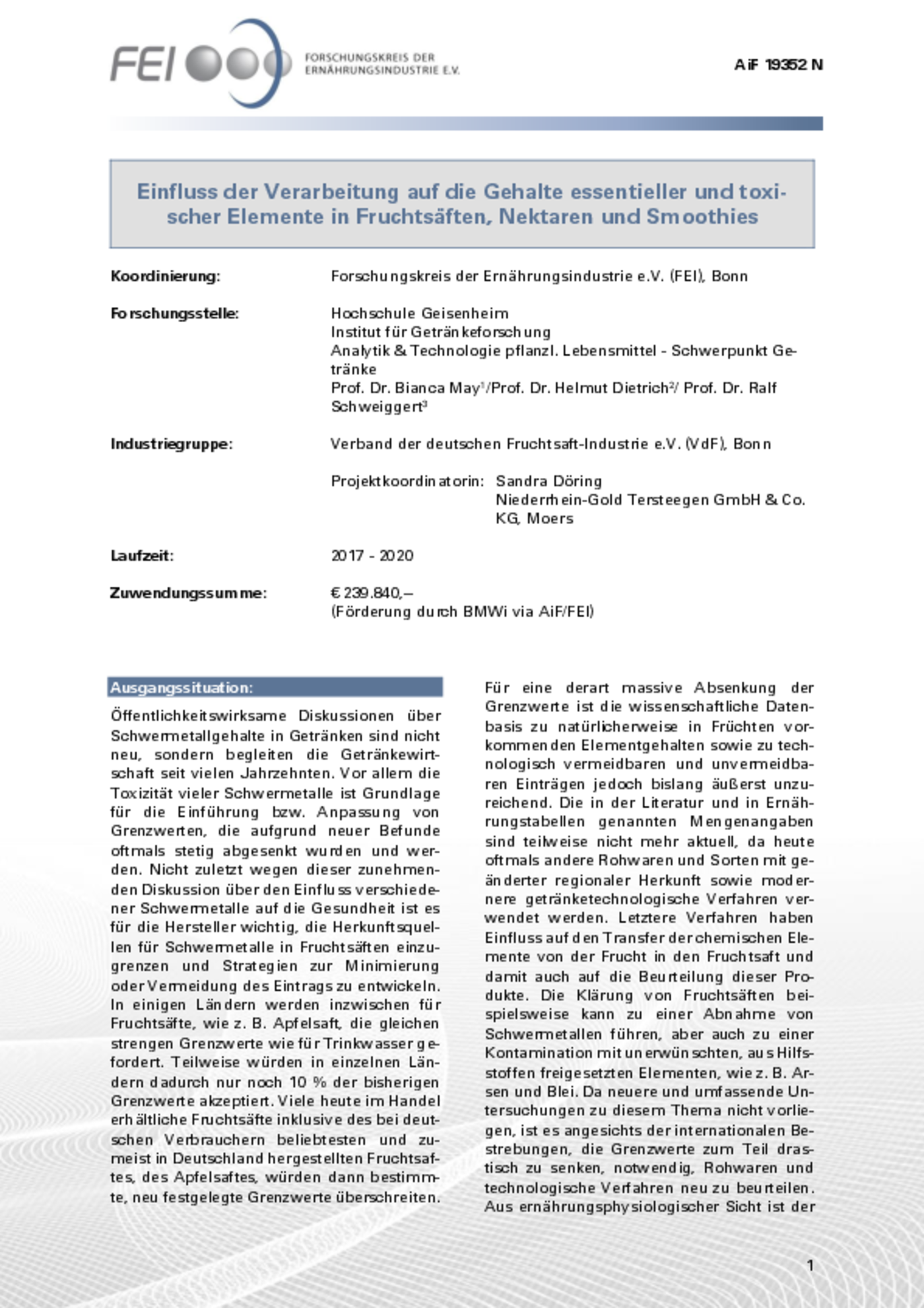 Einfluss der Verarbeitung auf die Gehalte essentieller und toxischer Elemente in Fruchtsäften, Nektaren und Smoothies