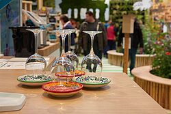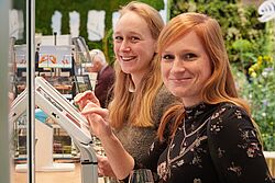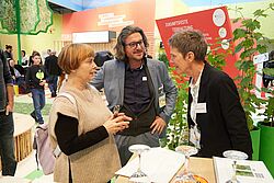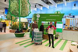 Die Projektmitarbeiterinnen und -mitarbeiter am VITIFIT-Messestand in der Halle des BMEL (Halle 23a) bieten die Verkostung von zwei PIWI-Weinen an und präsentieren vielfältige Informationen zum Projekt sowie zum ökologischen Weinbau.