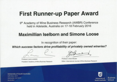 weiterlesenMaximilian Iselborn und Prof. Simone Loose haben auf der 9th Academy of Wine Business Research den Runner-up Best Paper Award für den Beitrag „Which success factors drive profitability of privately owned wineries“ erhalten. Die Academy of Wine Business Research ist das weltweit bedeutsamste Forum…