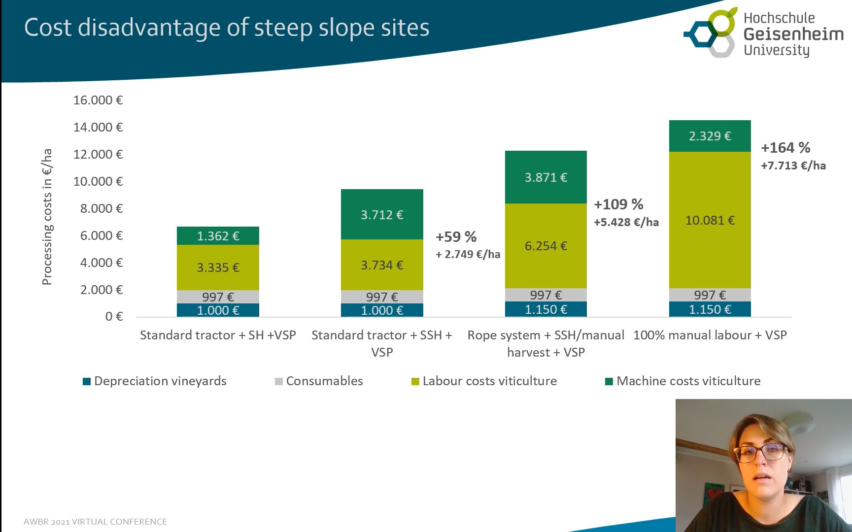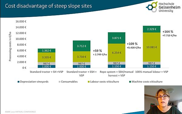 Die Vorträge stellen einen Teil des Wissenstransfers ihrer empirischen Ergebnisse zu den Kostennachteilen der Traubenproduktion in Weinbausteillagen und möglichen Ansätzen zur Steigerung der ökonomischen Nachhaltigkeit dar. Neben den Kostenvorteilen der Mechanisierung von Steillagen hat Larissa Strub die Optionen der Querterrassierung und des Einsatzes von Minimalschnitt-Systemen auf Basis von 3.400 Arbeitszeitaufzeichnungen von fünf kooperierenden Weingütern über drei Jahre analysiert.