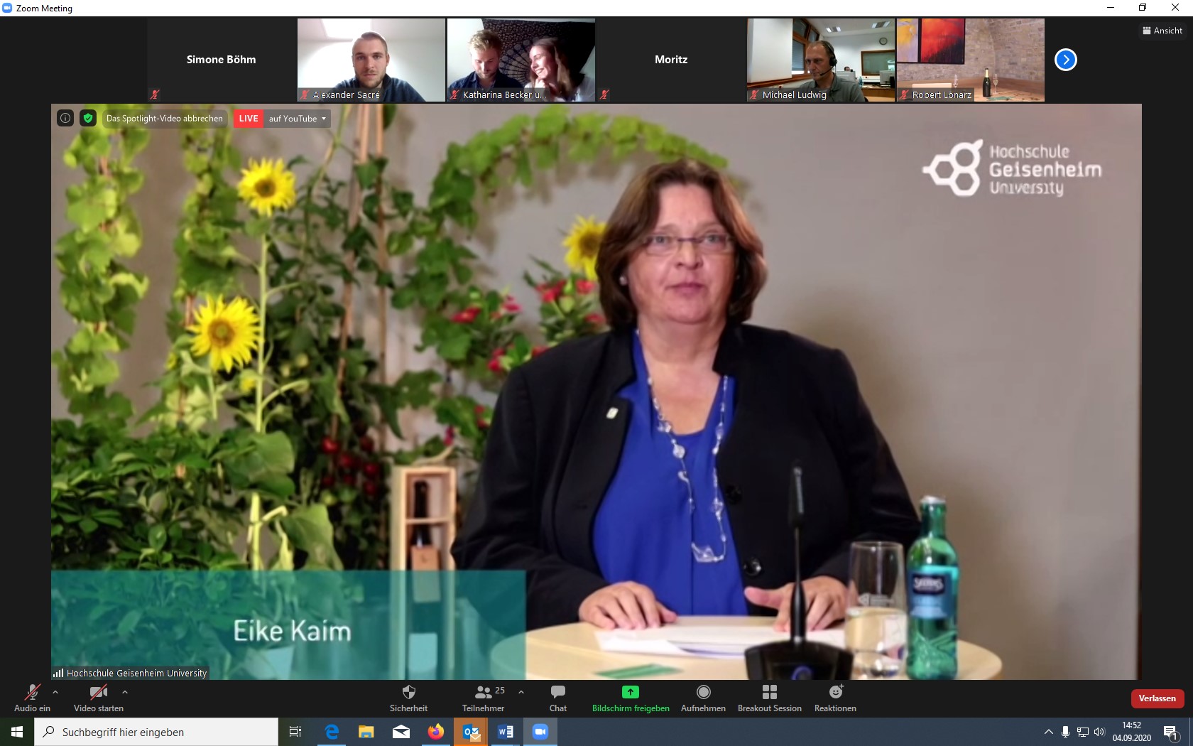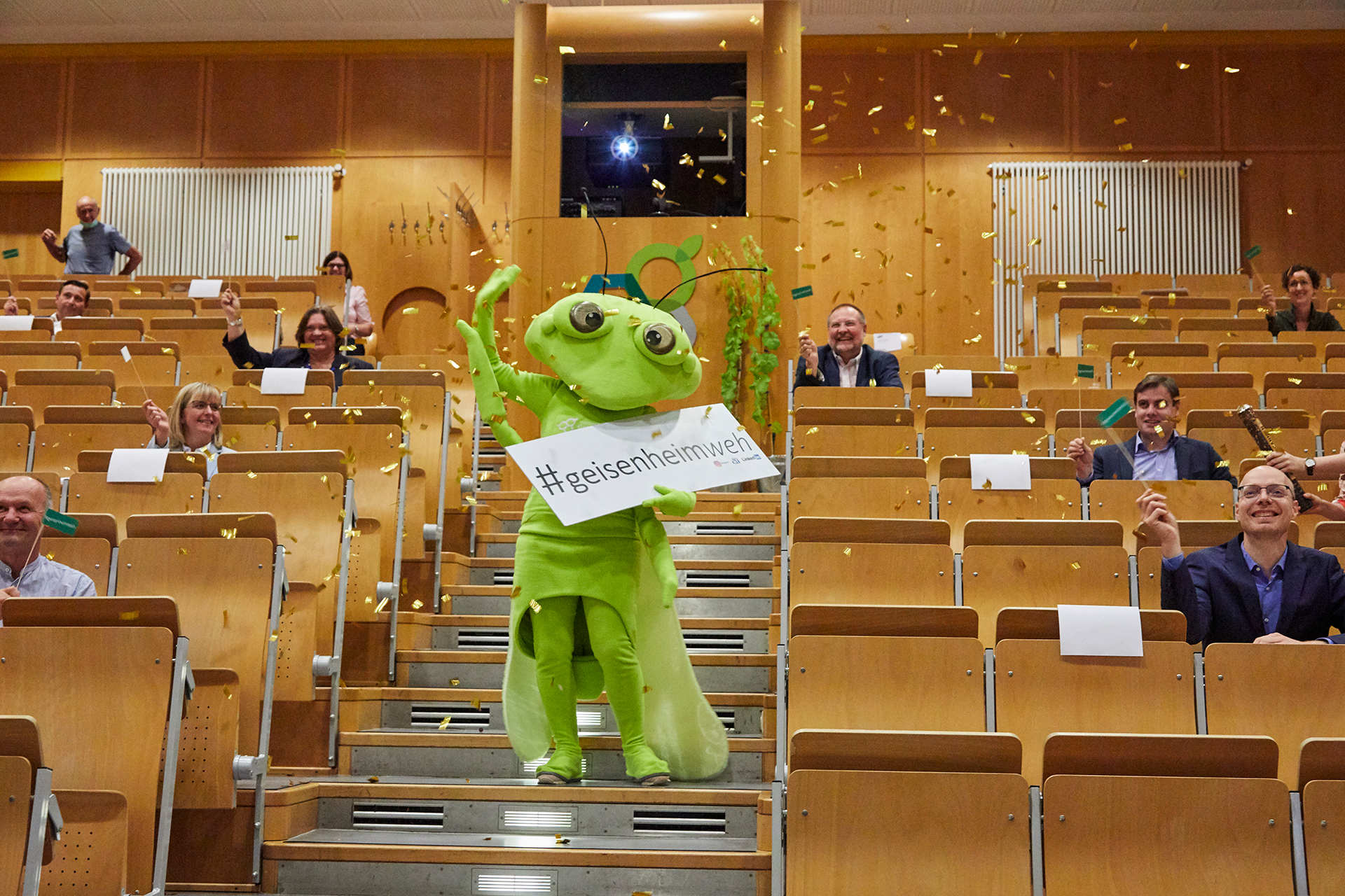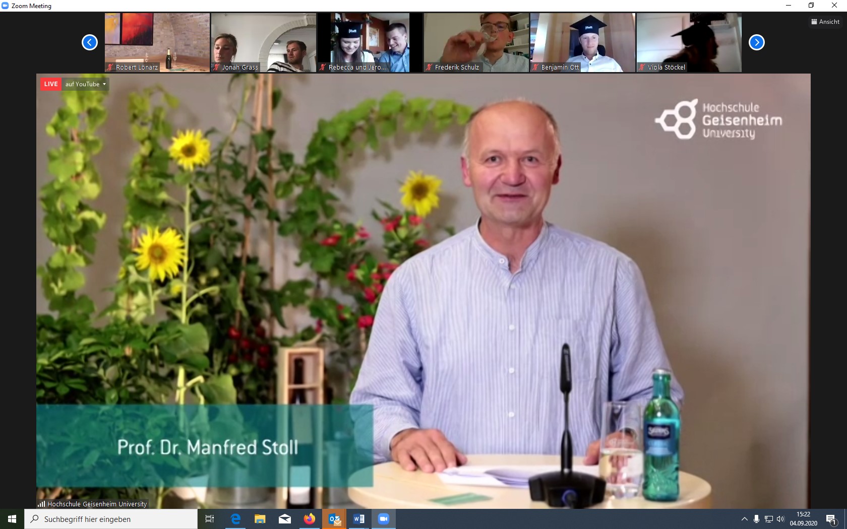 Der Bürgermeister der Hochschulstadt Geisenheim Christian Aßmann entrichtete seine Grußworte ebenfalls live aus dem Hörsaal. Er ermutigte die Absolventinnen und Absolventen, „tragen Sie das raus, was Sie in Geisenheim erlebt haben“ und „tragen Sie dazu bei, dass ‚Geisenheimer‘ der Begriff bleibt, der er heute ist“. Weitere Vertreterinnen und Vertreter von Verbänden und aus der Politik hatten zudem Grußbotschaften mit ihren Glückwünschen für die Absolventinnen und Absolventen eingesendet. Abgerundet wurde die Feier mit eigenes produzierten Filmclips mit dem Hochschulmaskottchen Flora, der Florfliege, die die Campus- und Studienatmosphäre auf humorvolle Art und Weise noch einmal zu den Absolventinnen und Absolventen nach Hause brachte.