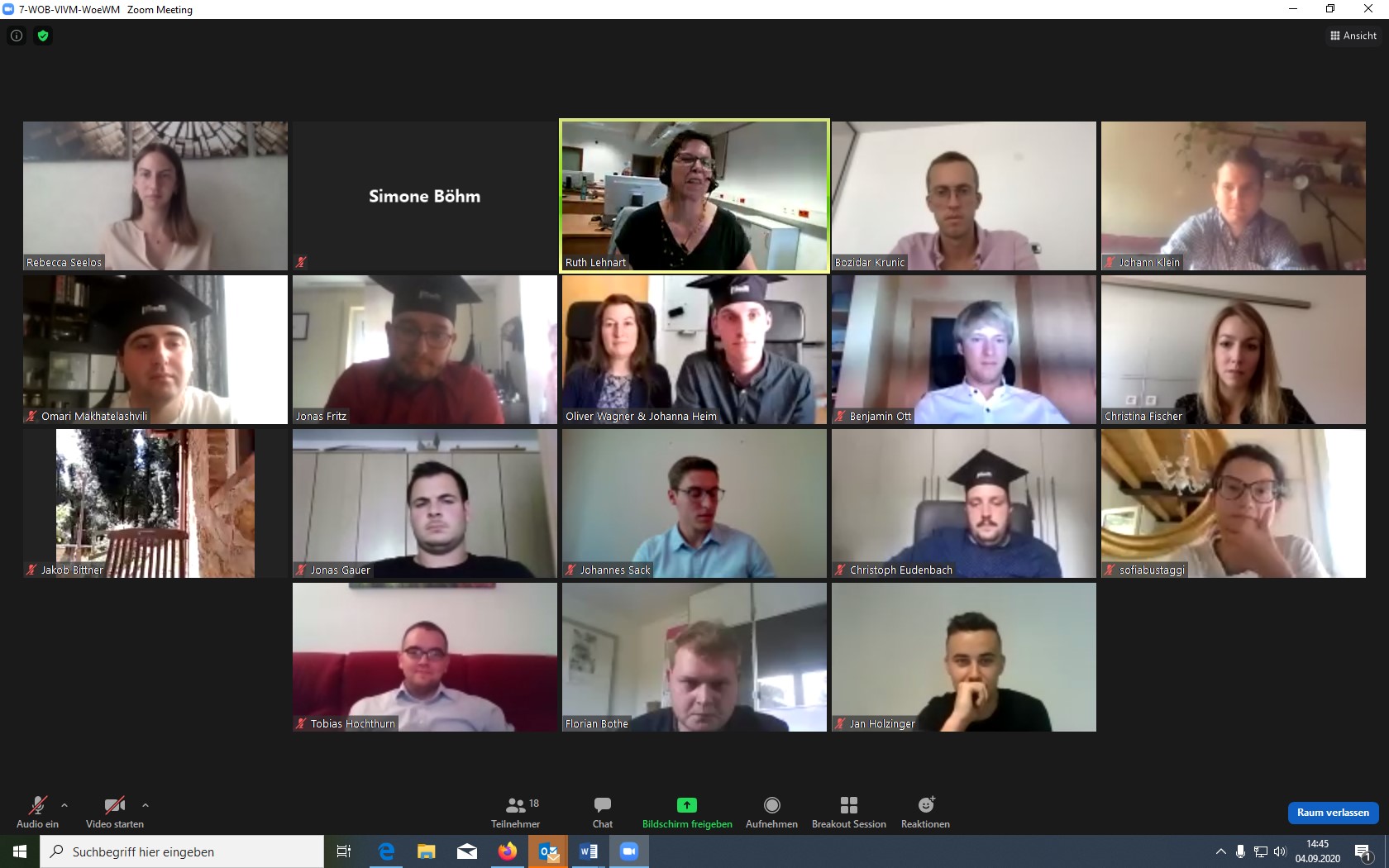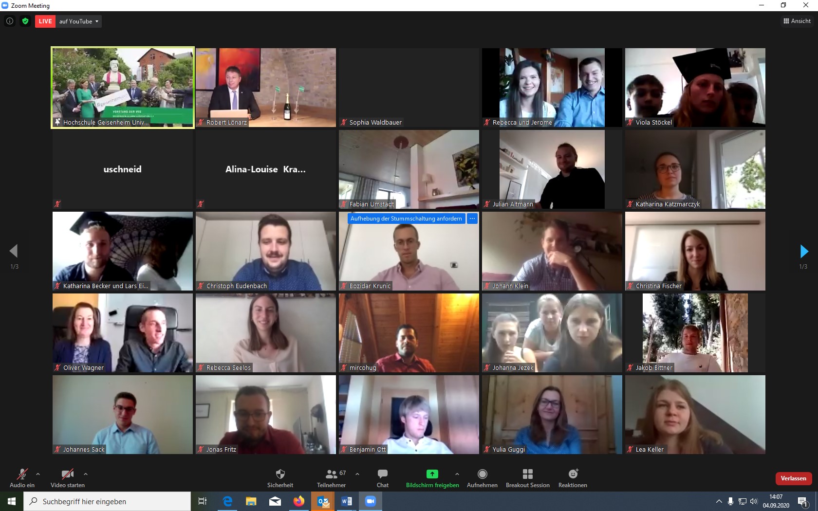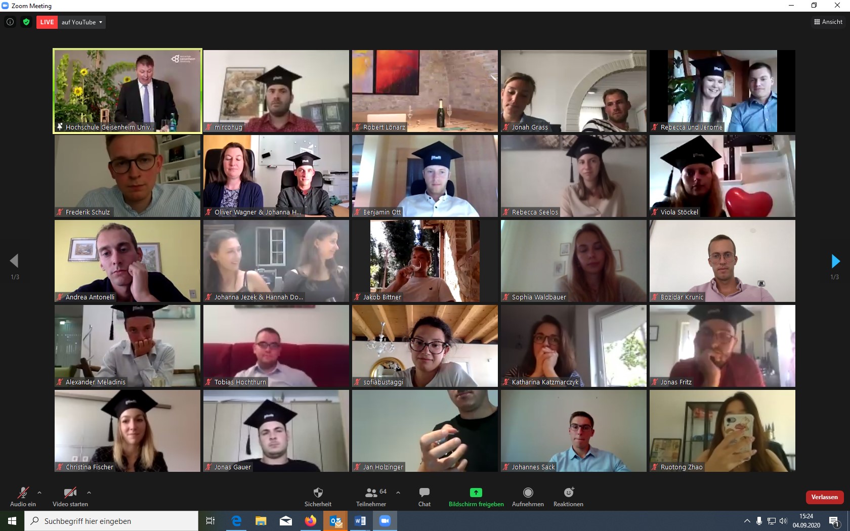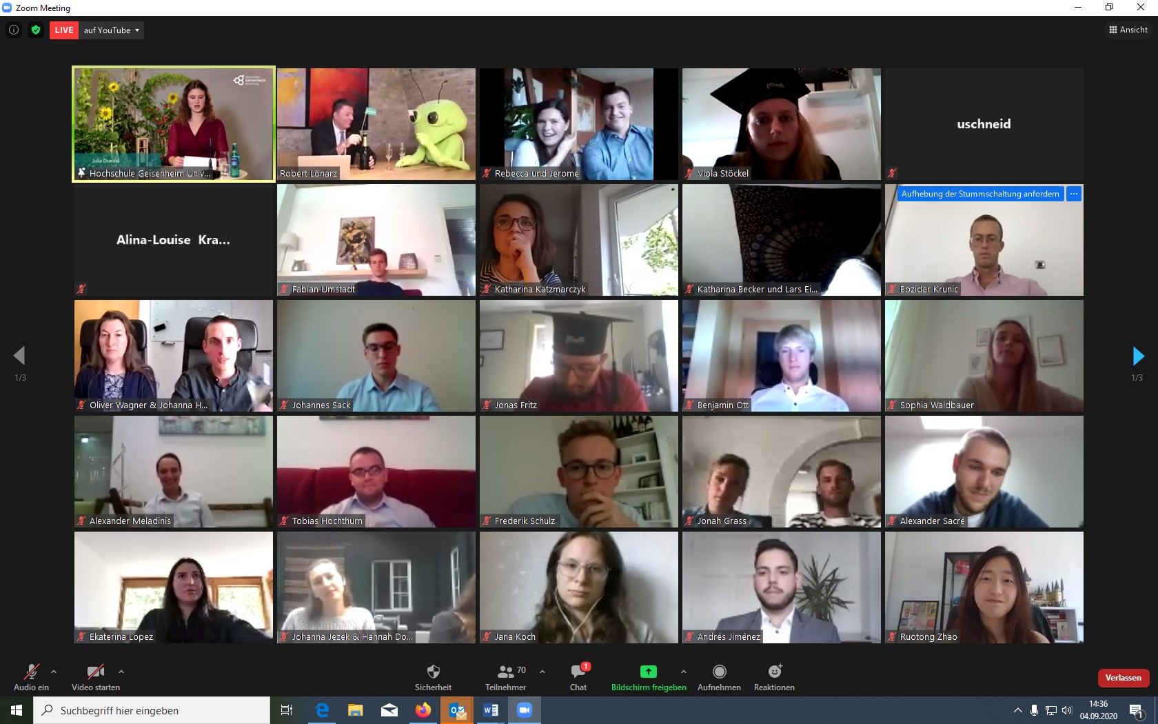 Virtuelles Gläserklirren in Geisenheim: Um den Absolventinnen und Absolventen des Sommersemesters 2020 einen gebührenden Abschied zu bereiten, hat die Hochschule Geisenheim ihre Akademische Abschlussfeier am Freitag, 04. September 2020, erstmals online gefeiert. Mit einem bunten Programm aus dem Gerd-Erbslöh-Hörsaal verabschiedeten die Studiengangleiterinnen und -leiter gemeinsam mit dem Präsidium der Hochschule Geisenheim und deren Ehemaligenverband, der VEG – Geisenheim Alumni Association e. V., sowie dem Bürgermeister der Hochschulstadt Geisenheim Christian Aßmann 152 Absolventinnen und Absolventen aller Bachelor- und Master-Studiengänge.