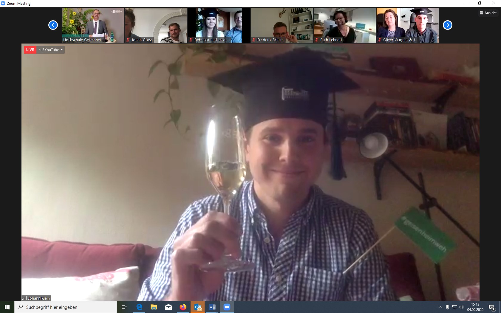 „Mit den Zeugnissen erhalten wir heute die Eintrittskarten in einen neuen Lebensabschnitt. Und es ist egal, welchen Weg wir einschlagen, solange wir mit Leidenschaft bei der Sache sind“, betonte Julia Oswald, Absolventin des Studiengangs Weinbau und Oenologie (B.Sc.) in ihrer Abschlussrede für die Studierendenschaft. Alle Absolventinnen und Absolventen hatten im Vorfeld der Feier ein Überraschungspaket mit Sekt und dem obligatorischen Abschlusshut – ganz altmodisch und analog – per Post erhalten. Sie schalteten sich über eine Videokonferenz zu. Freunde und Familie hatten die Möglichkeit, die Abschlussfeier im Live-Stream zu verfolgen; zahlreiche Interessierte nahmen dieses Angebot wahr.