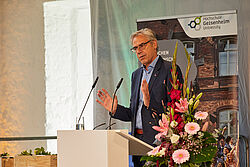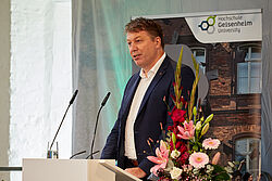 Hochschulpräsident Prof. Dr. Hans Reiner Schultz nutzte den Rahmen auf Schloss Johannisberg auch für die Würdigung scheidender Professoren der Hochschule: Prof. Dr. Frank Will vom Institut für Getränkeforschung, Prof. Dr. Jürgen Jaki, Professor für Physik, und Prof. Dr. Stephan Roth-Kleyer, Professor für Vegetationstechnik, sind bereits im oder stehen kurz vorm Ruhestand.