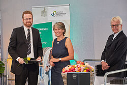Im zweiten Teil der Verabschiedung wurden Dr. Larissa Strub und Dr. Yvette Wohlfahrt geehrt. Strub hat zum Thema „Cost Efficiency and Sustainability in Steep Slope Viticulture“ promoviert. Die „Effects of elevated CO2 on physiology, yield and fruit composition of Vitis vinifera L. cvs. Riesling and Cabernet Sauvignon“ untersuchte wiederum Wohlfahrt in ihrer Doktorarbeit. Seit 2014 haben insgesamt 32 Nachwuchswissenschaftlerinnen und -wissenschaftler ihre Promotion an der Hochschule Geisenheim abgeschlossen. Aktuell sind am Standort 80 Promovierende in den fünf Forschungsbereichen aktiv; 41 Frauen und 39 Männer.