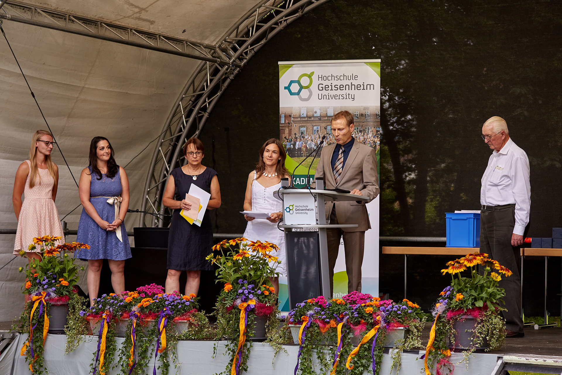 Musikalisch wurde die festliche Veranstaltung von Julia Keidl untermalt. Hochschulpräsident Prof. Dr. Hans Reiner Schultz nutzte den Rahmen für die Ehrung scheidender Professoren der Hochschule: Prof. Dr. Helmut Dietrich, ehemaliger Leiter des Instituts für Weinanalytik und Getränkeforschung, Prof. Dr. Manfred Großmann, Leiter des Instituts für Mikrobiologie und Biochemie, sowie Prof. Dr. Joachim Heller, Professor für Internationalen Gartenbau, sind bereits in oder stehen kurz vorm Ruhestand. Prof. Gerd Helget dankte den Förderern und Empfängern des Deutschlandstipendiums. Weiterer Höhepunkt war die Verleihungen von vier Preisen an herausragende Absolventinnen und Absolventen aus verschiedenen Studienbereichen.