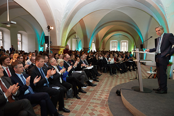 Fliegende Hüte im historischen Kreuzgang: Erstmals feierte die Hochschule Geisenheim am Samstag, 18. Februar 2017, ihre Absolventinnen und Absolventen im Laiendormitorium zu Kloster Eberbach; insgesamt 152 Studierende schlossen im Wintersemester 2016/17 ihr Bachelor- oder Master-Studium ab. Prof. Dr. Manfred Großmann, Vizepräsident Forschung der Hochschule Geisenheim, überreichte zudem die Promotionsurkunden persönlich an drei von vier Geisenheimer Wissenschaftler, die im vergangenen Jahr ihre Dissertationen abgeschlossen hatten. Die Feier mit Festredner Martin Blach, Vorsitzender des Vorstandes der Stiftung Kloster Eberbach, bildete auch den Rahmen für die Verabschiedung von Prof. Dipl.-Ing. Siegbert Sattler in den Ruhestand.