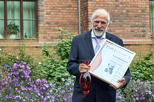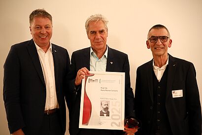 „Für Prof. Dr. Otmar Löhnertz war und ist Forschung ohne Erdung ein ‚no go‘ und die Ausbildung einer kritischen, neuen Generation des Berufsstandes ein ‚must have‘. Das zeigte sich von Anbeginn im Ziel seiner Forschung, dem Berufsstand Lösungen anzubieten, die zur Bewältigung der Aufgaben eines Betriebes beitragen, und darin, die Lehre so auszurichten, dass sie die neuesten Erkenntnisse einbezieht, damit ein wachsamer, kritischer Berufsstand heranwächst.“ Mit diesen Worten leitete Prof. Dr. Manfred Stoll, Leiter des Instituts für allgemeinen und ökologischen Weinbau an der Hochschule Geisenheim, seine Laudatio für den diesjährigen Träger des Professor Müller-Thurgau Preises bei der feierlichen Verleihung am 22. Oktober 2022 ein. Prof. Dr. Otmar Löhnertz erhielt den Ehrenpreis der Hochschule Geisenheim und deren Ehemaligenverbandes, der VEG – Geisenheim Alumni Association e. V., für seine umfassenden Verdienste um den Lehr- und Forschungsstandort Geisenheim – in Forschung, Lehre, Wissenstransfer und der Selbstverwaltung.