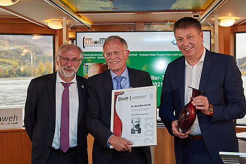 „Dr. Bernhardt kam eine besondere Rolle bei der Hochschulgründung zu, die wir mit der Verleihung des Professor Müller-Thurgau-Preises sichtbar machen und würdigen wollen. Er hat damals das Bekenntnis zu angewandter Forschung – den Spagat der Hochschule zwischen grundlegenden und angewandten Arbeiten – unterstützt und mitgetragen. Jüngst hat Dr. Bernhardt die Hochschule bei der Entwicklung eines neuen Strategiekonzepts beraten; für die Institution war und ist seine Erfahrung im Bereich der Entwicklung von Hochschulen ungemein wertvoll“, so Prof. Dr. Otmar Löhnertz, langjähriger Vizepräsident Lehre und Dekan an der Hochschule Geisenheim und ihrer Vorgängerinstitution, in seiner Laudatio im Rahmen der Feierstunde an Bord der MS Rhein Star. Dr. Bernhardt bleibt dem Hochschulstandort Geisenheim auch in Zukunft treu: Als Mitglied im Ehemaligenverband möchte er sich auch im Ruhestand weiter für Geisenheim einsetzen.