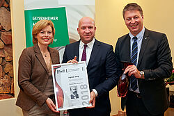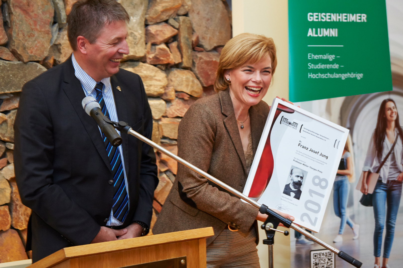 Der Professor Müller-Thurgau Preis geht an Persönlichkeiten, die sich viele Jahre um den Erhalt und die Förderung von Forschung und Lehre, sowie um die Belange der Studierenden an der Hochschule Geisenheim außerordentlich verdient gemacht haben. „Insbesondere zur Hochschulgründung waren beide diesjährigen Preisträger unermüdliche Kämpfer und Stabilisatoren für den Hochschulstandort Geisenheim“, lobte Lönarz. „Wir freuen uns deshalb besonders, mit Bundeslandwirtschaftsministerin Julia Klöckner die perfekte Laudatorin für die Würdigung von Dr. Franz Josef und Ingmar Jung gewonnen zu haben.“
