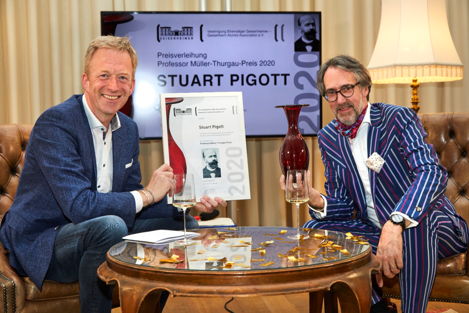 Unterhaltsam und vielfältig wie der Preisträger selbst war die Verleihung des Professor Müller-Thurgau Preises 2020 der Hochschule Geisenheim und ihres Alumniverbandes, der VEG – Geisenheim Alumni Association e. V., an Weinkritiker Stuart Pigott am gestrigen Dienstag, 26. Mai 2020. Aufgrund der aktuellen Situation fand die Verleihung vor Ort nur im kleinen Kreis statt. Interessierte hatten aber erstmals die Möglichkeit, via Live-Stream dabei zu sein.
