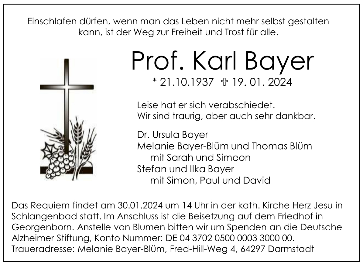 Karl Bayer verstarb am 19. Januar 2024 in Karlsruhe. Gemeinsam werden wir Professor Dipl.-Kfm. Karl Bayer ein würdiges Andenken bewahren!