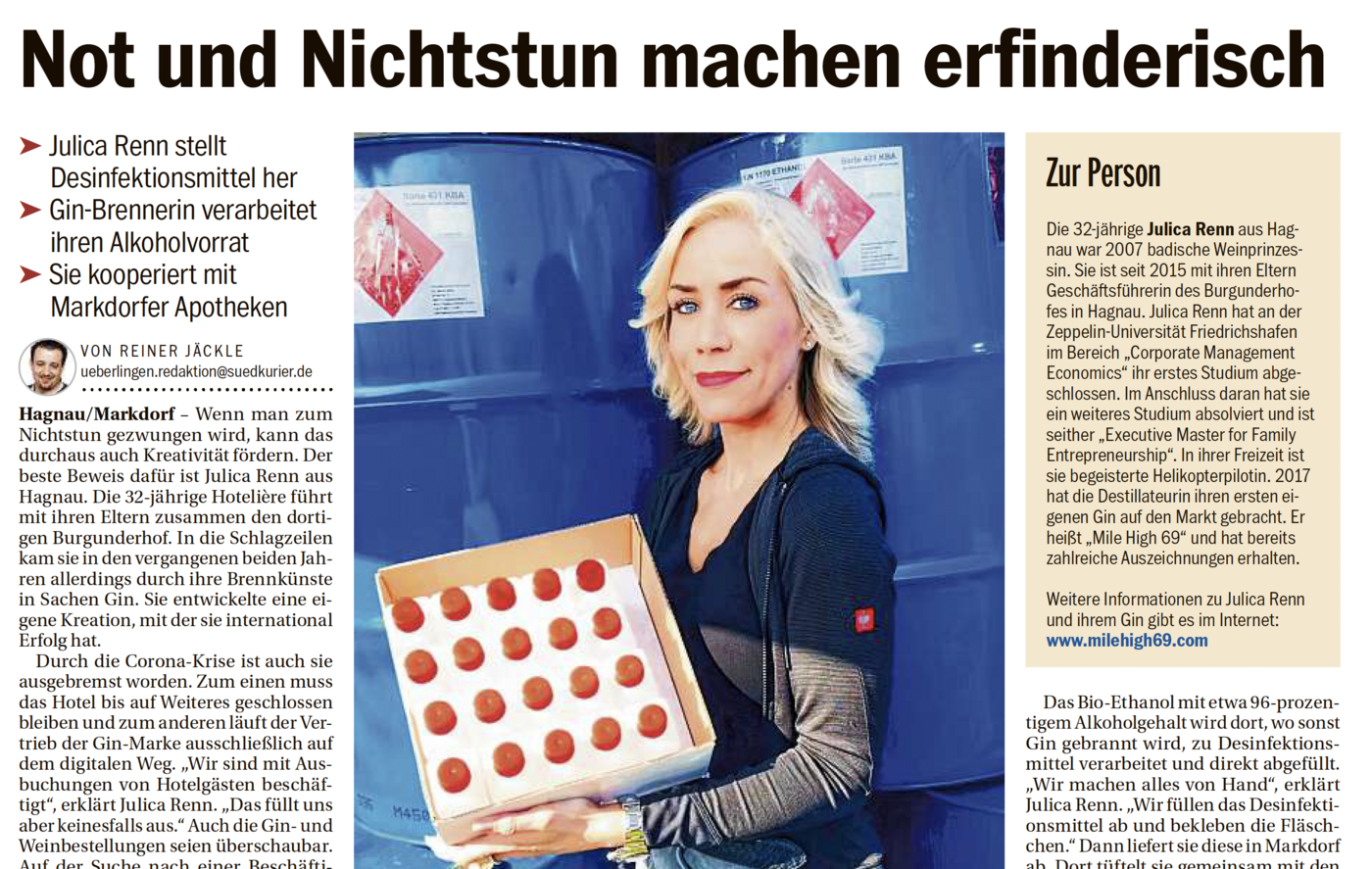 "Wenn man zum Nichtstun gezwungen wird, kann das durchaus auch Kreativität fördern. Der beste Beweis dafür ist Julica Renn aus Hagnau. Die 32-jährige Hotelière führt mit ihren Eltern zusammen den dortigen Burgunderhof. In die Schlagzeilen kam sie in den vergangenen beiden Jahren allerdings durch ihre Brennkünste in Sachen Gin. Sie entwickelte eine eigene Kreation, mit der sie international Erfolg hat. Durch die Corona-Krise ist auch sie ausgebremst worden. Zum einen muss das Hotel bis auf Weiteres geschlossen bleiben und zum anderen läuft der Vertrieb der Gin-Marke ausschließlich auf dem digitalen Weg. „Wir sind mit Ausbuchungen von Hotelgästen beschäftigt“, erklärt Julica Renn. „Das füllt uns aber keinesfalls aus.“ Auch die Gin- und Weinbestellungen seien überschaubar. Auf der Suche nach einer Beschäftigung erhielt sie einen Anruf von einem Freund. Durch die momentane große Nachfrage nach Desinfektionsmitteln rücken Destillateure immer häufiger in den Fokus. (---) " Südkurier, Reiner Jäckle 28. März 2020
