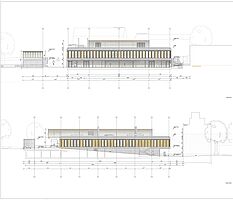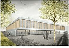 Das Gebäude formuliert nach Süden hin, zum künftigen Campusplatz, über das zurückspringende Untergeschoss und die darüber befindliche Bürospange eine einladende, wettergeschützte Geste. Die Nordseite hingegen ist durch die Anliefersituation der Produktionshalle an der Falterstrasse geprägt, welche sehr stark funktional dominiert ist. Den Kern des Gebäudes bildet die Produktionshalle, welche dreiseitig von Unterrichts- und Praktikumsräumen, sowie Büros eingefasst wird. Das weitgespannte Dach der Produktionshalle erhebt sich über den umliegenden Baukörper, am Versatz kann natürliches Tageslicht in die innenliegende Halle fallen. Der transluzente Dachbaukörper kragt an der Nordseite aus und schafft die gewünschte, überdeckte Anliefersituation. Im Sockelgeschoss befinden sich die Umkleiden, Lager und Technikflächen, die repräsentative Sektmanufaktur, sowie auf der Ostseite eine Werkstatt sowie Aufenthaltsräume für die Mitarbeiter des GTZ. Die Sektmanufaktur stellt einen besonderen Bereich dar und wird deshalb an prominenter Stelle angrenzend zum Campusplatz verortet. Hier können Einblicke in die Sektherstellung ermöglicht werden, weshalb eine Verglasung zwischen Foyer und Sektmanufaktur umgesetzt ist.