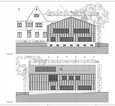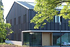 Die Fassade besteht aus einer vorgehängten hinterlüfteten Bekleidung aus dunkel-silbrig vorvergrauten Vollholzprofilen und -brettern. Diese ist durch vertikale Lisenen strukturiert und nach oben gestaffelt, was sowohl den klassischen Regeln des konstruktiven Holzschutzes folgt, als auch ein gestalterisches Thema der Mansarddach-Bekleidung des Nachbargebäudes aufgreift und interpretiert. Die Ausbildung des steinernen Sockels aus hellen Werksteinelementen als robuste und alterungsfähige Gebäudebasis versteht sich ebenso als Fortführung der umgebenden Beispiele.