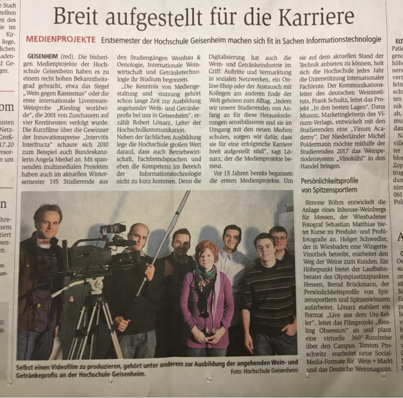 Im Rahmen der Lehrveranstaltung "Informationstechnologie" von Prof. Dr. Jürgen Jaki werden für die Studiengänge Weinbau und Oenolgie, Internationale Weinwirtschaft, International Wine Business und Getränketechnolgie bereits im ersten Semester praxisnahe Projekte im Bereich der "Neuen Medien" angeboten.