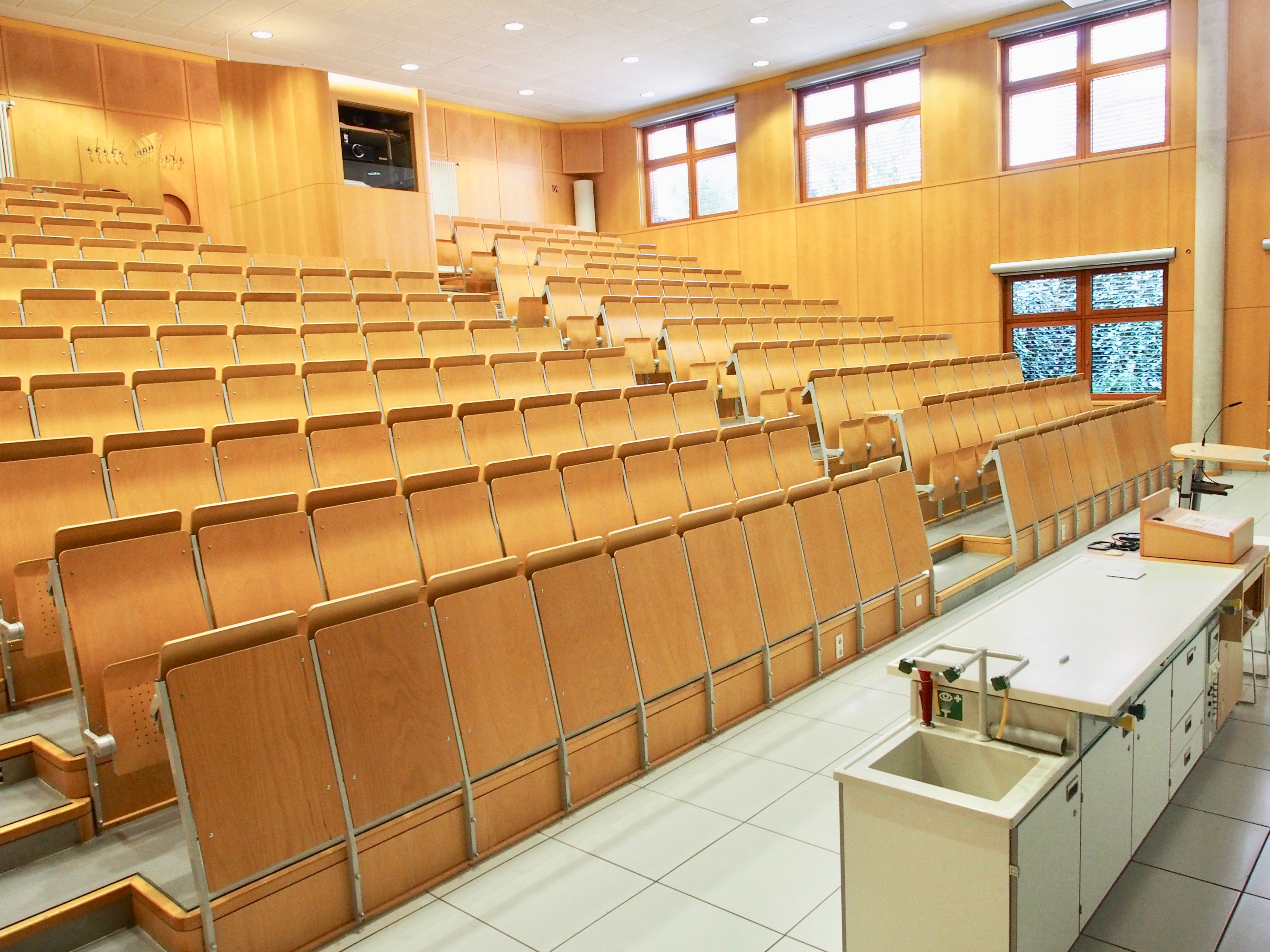 | Besonderheiten | Licht dimmbar, Medienkabine mit Möglichkeit zur Videoaufnahme, Chemiepult mit Abluft, Waschbecken und Gasanschlüssen, Mikrofonanlage. |