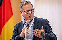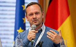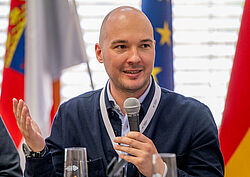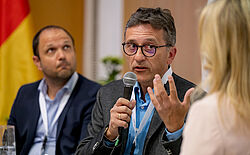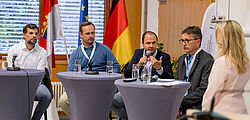 Im Fokus des Formats stehen der persönliche Austausch, die interdisziplinäre Vernetzung und die kritische Auseinandersetzung mit Fragestellungen, die über die Grenzen der Branchen hinaus reichen. In insgesamt drei Podiumsdiskussionen kamen am Freitag (2.) deshalb neben Branchenvertretern – etwa Simon Weiss von der Mack & Schühle AG, Gregory Emmel von GrapeAlliance und Bernhard Jung von der Carl Jung GmbH – auch Expertinnen und Experten aus anderen Feldern zu Wort: Spitzenkoch Janko Hilliges, Chef2Chef Manager bei Nestlé Professional, der Geisenheimer Professor für nachhaltigen Ressourceneinsatz und Stoffstromanalysen bei Sonderkulturen Dr. Moritz Wagner und Felipe Bergmann Segovia, CEO des IT-Dienstleisters FBS-Solution.