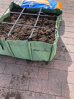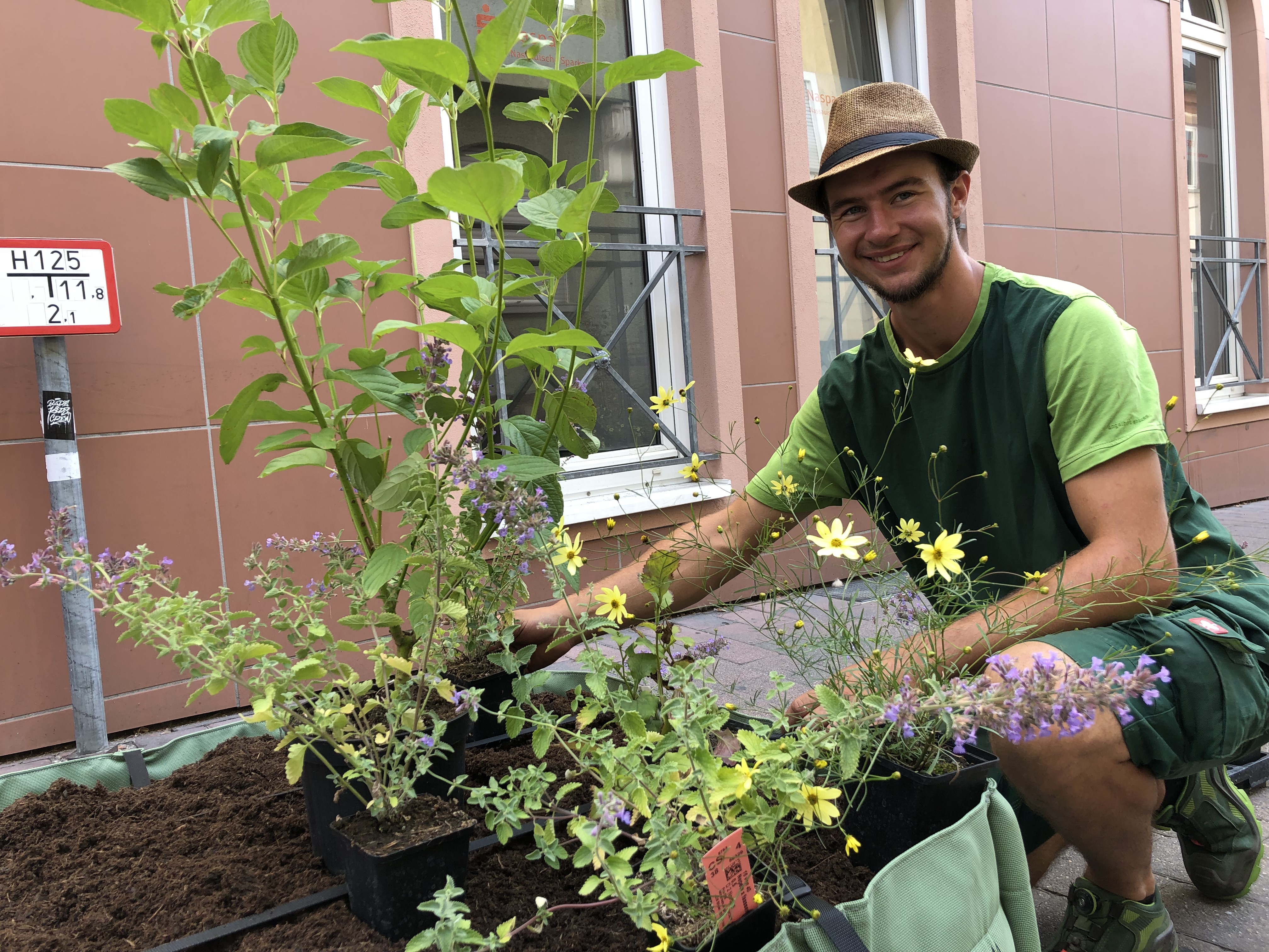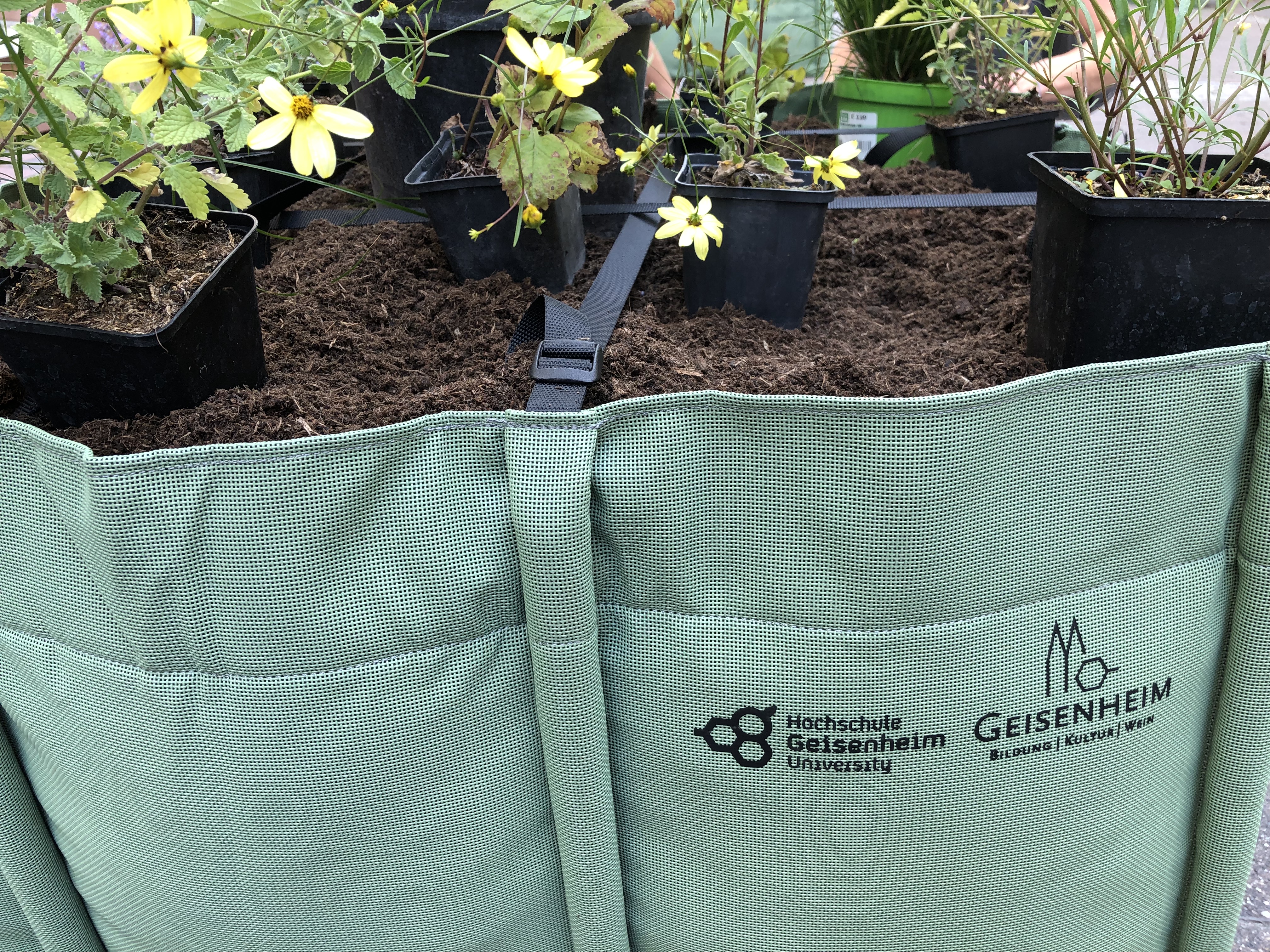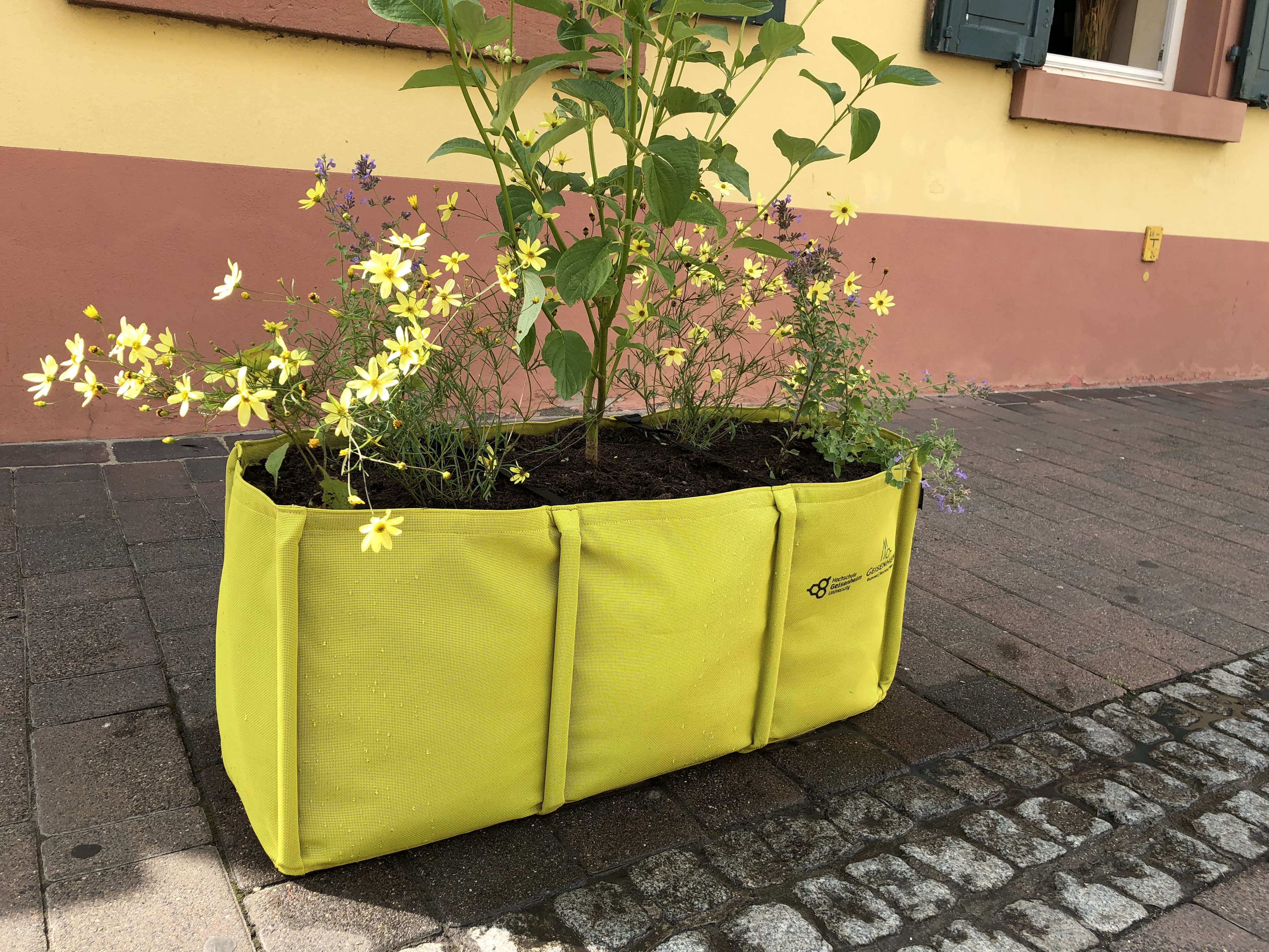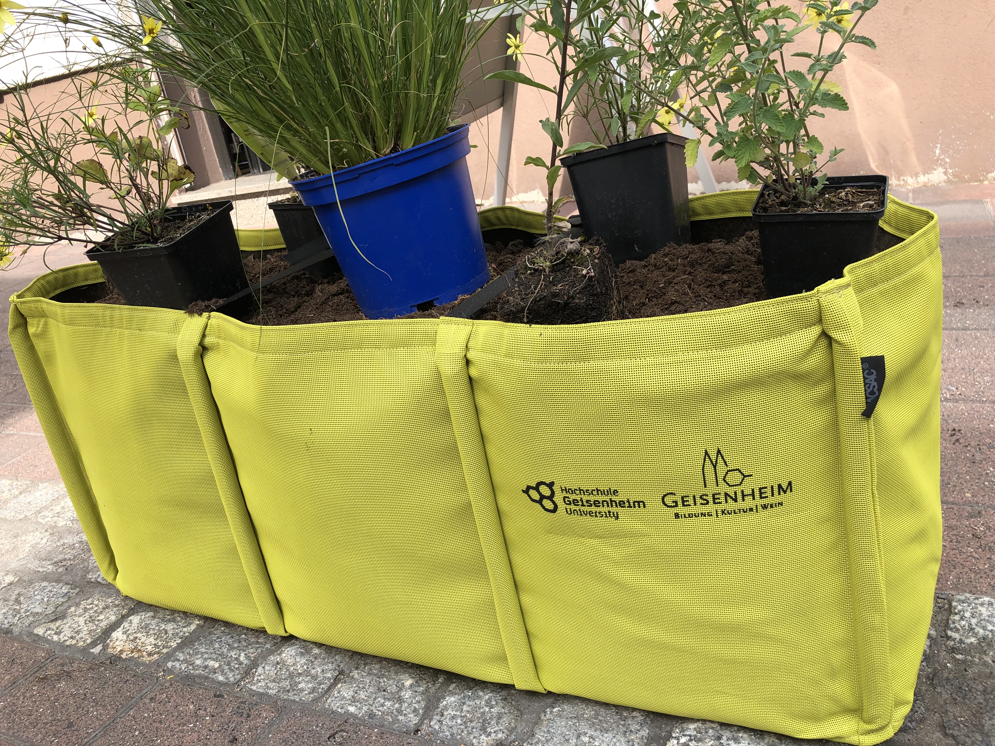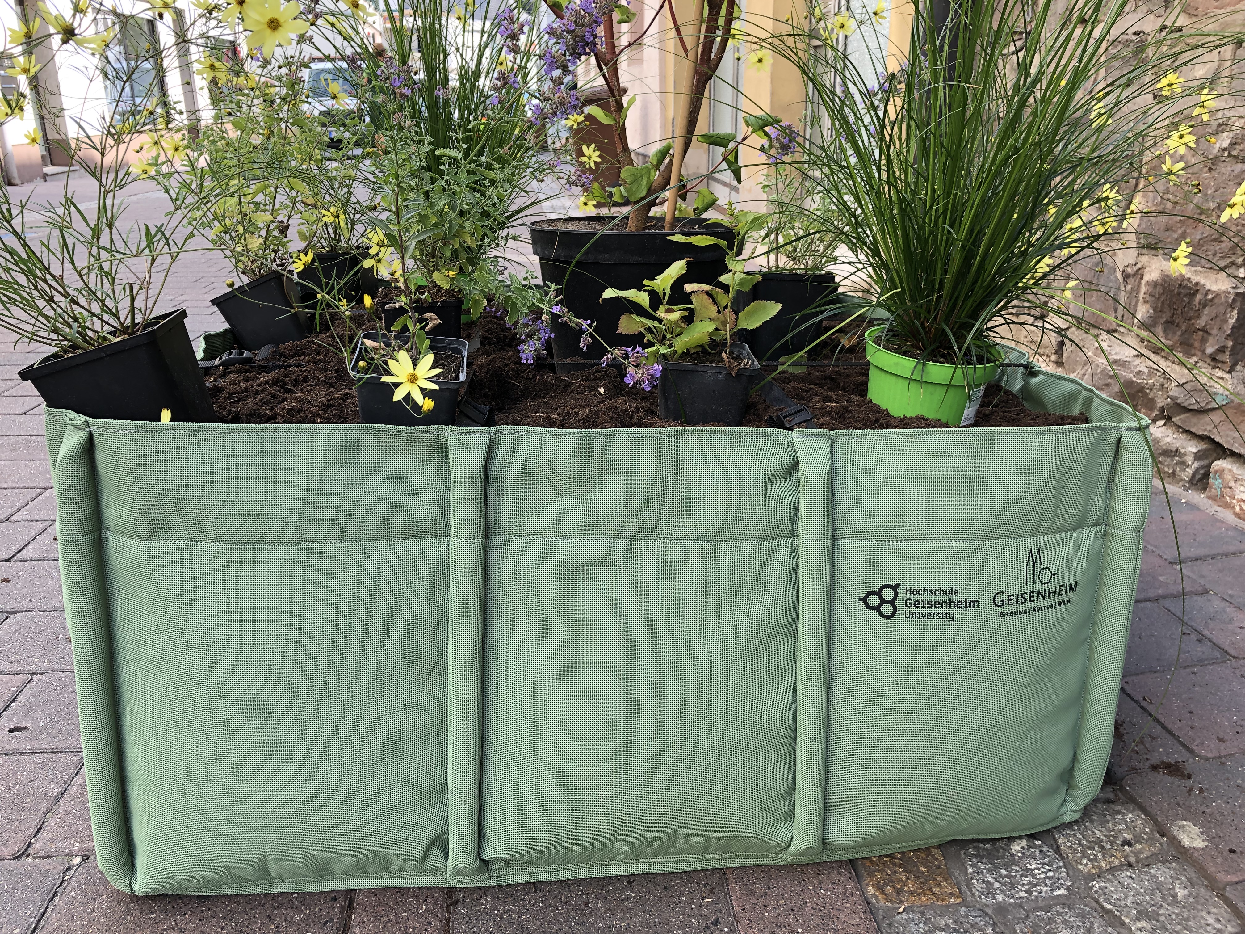 Als sichtbares Zeichen der Kooperation im Rahmen des Projekts sind die Logos von Hochschule und Stadt auf den farbenfrohen Taschen aufgebracht. Als temporäre Begrünung angedacht, dienen die bepflanzten Taschen sowohl der visuellen Aufwertung des Straßenraumes als auch der Verkehrsberuhigung.