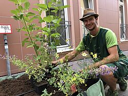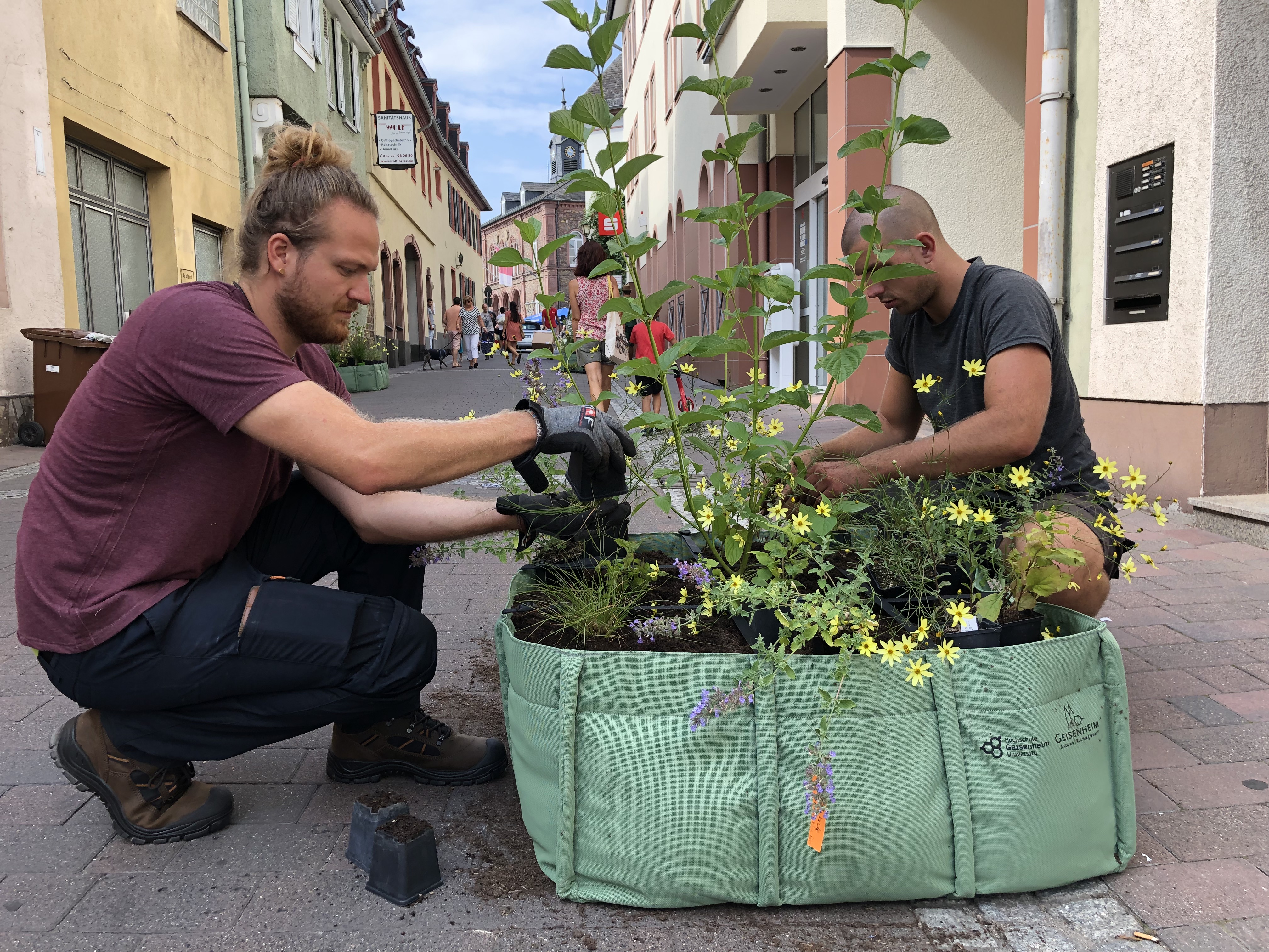 Das Projekt Grünes Geisenheim wertete mit tatkräftiger Unterstützung des Bauhofes und der Mitarbeiter des Instituts für urbanen Gartenbau und Pflanzenverwendung der Hochschule Geisenheim Anfang August 2019 die Winkeler Straße auf: Gemeinsam platzierten die Beteiligten farbige Pflanztaschen entlang des Straßenzugs.