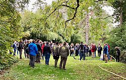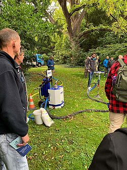 Auch die unmittelbare Praxis kam während der Tagung nicht zu kurz. Im Foyer präsentierten mehrere Aussteller ihre Produkte und Dienstleistungen rund um das Thema Bäume und Baumpflegemanagement. Bereichert wurde die Veranstaltung zudem durch eine praktische Vorführung im angrenzenden Hochschulpark. Die Firma Vogt demonstrierte hier die Möglichkeit der Bodenlockerung mittels Druckluftlanzen. Es war spannend zu beobachten, wie sich der Rasen vor den Füßen der Ausführenden anhob, während der Boden mit Druckluft gelockert und Bodenhilfsstoffe eingebracht wurden.