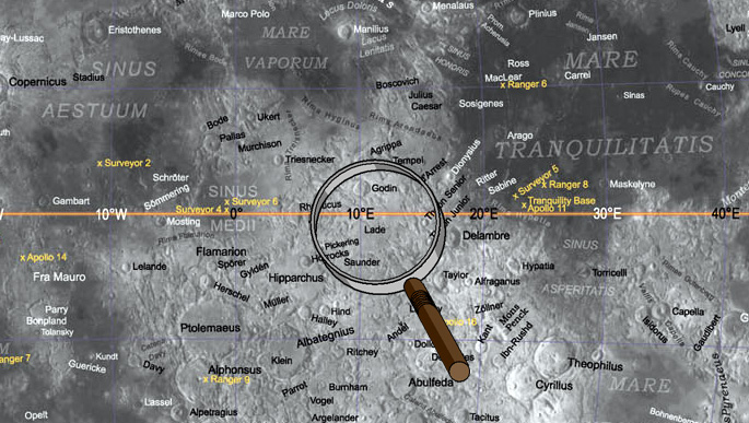 Bereits Eduard von Lade hatte den Bereich der Mondladung , südlich des Mare Tranquilitatis, studiert. Nach ihm wurde ein Mondkrater benannt „Lade„, der nur einige Kilomenter von den Landestellen von Apollo 11 und Apollo 14 entfernt liegt.