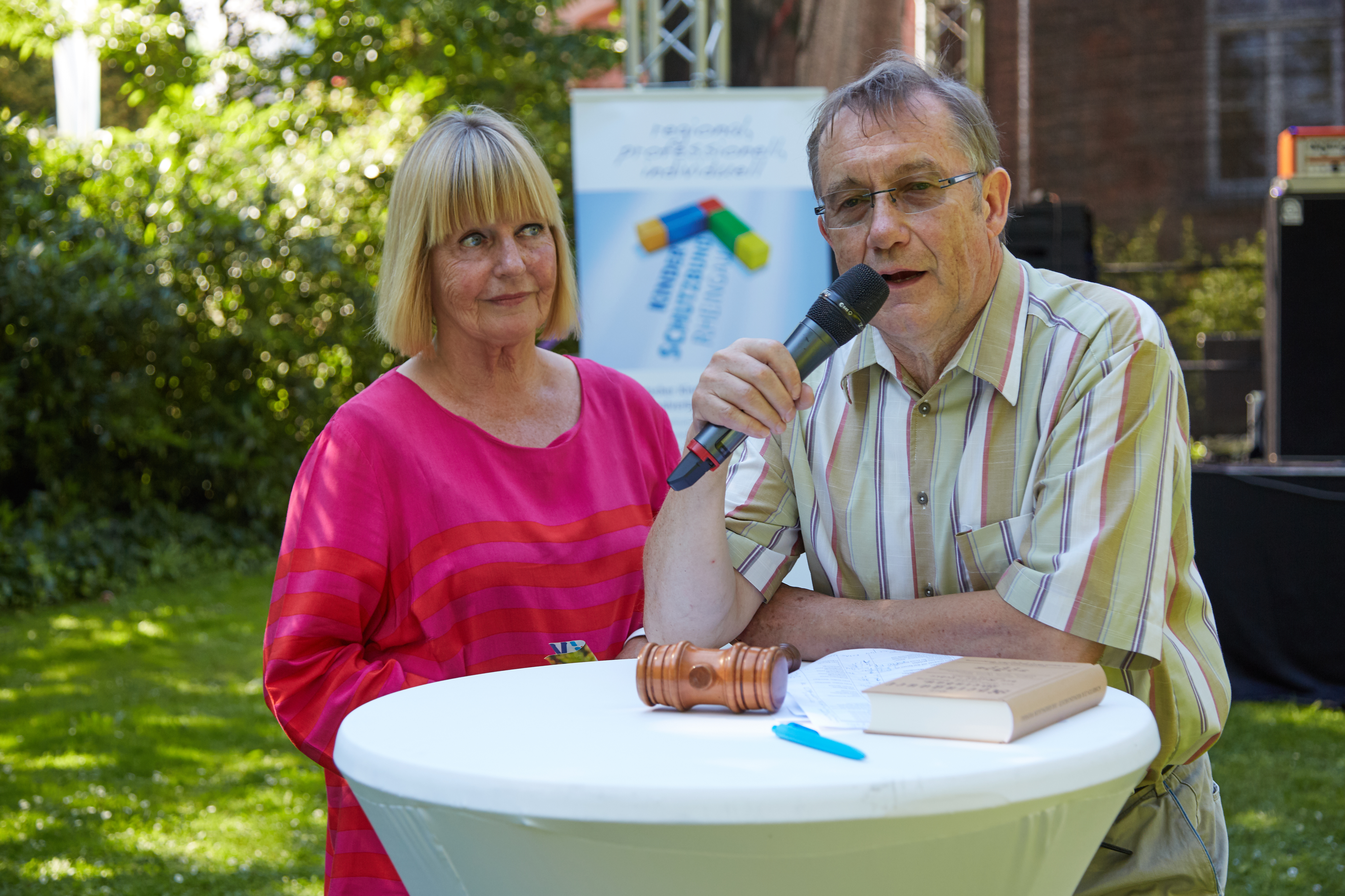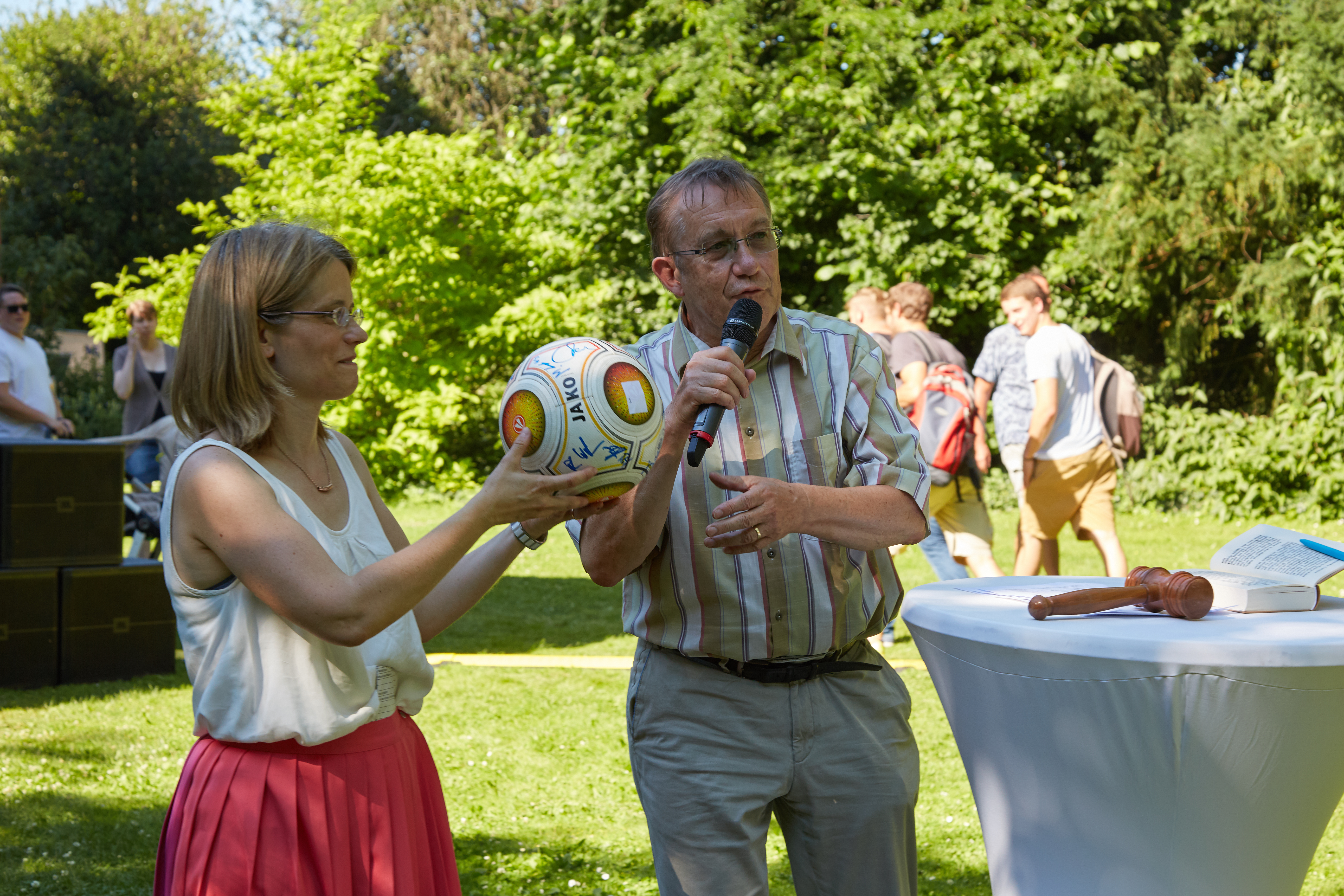 Weinspezialitäten, Züchtungen aus dem Zierpflanzenbau, ein signiertes Trikot der WEINELF und diverse Bücher: Nach einem gemeinsamen Aufruf des Präsidiums der Hochschule Geisenheim, des Personalrats und des Allgemeinen Studierendenausschusses (AStA) hatten die Mitarbeiter im Vorfeld des diesjährigen Hochschul-Sommerfests fleißig Sachspenden für eine Auktion getätigt. Prof. Dr. Leo Gros versteigerte diese bei bestem Sommerwetter dann wiederum unter den Mitarbeitern und Studierenden der Hochschule zu Gunsten des Kinderschutzbundes Rheingau e. V. – und erzielte einen Gesamterlös von 549,50 Euro.