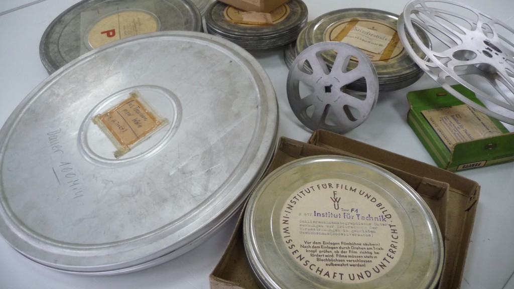 In dieser Woche bin ich mit meinem Kollegen Hans – Joachim Karl, unserem Chemiker im Grundlagenpraktikum, ein letztes Mal in den alten „Pferdestall“, der bislang das Chemische Praktikum beherbergte, gegangen. Auf dem Speicher machten wir eine wunderbare Entdeckung. In einer alten und verstaubten Kiste fanden wir eine ganze Anzahl 16mm Filmrollen. U.a. eine Rolle mit dem Titel „Rundgang durch die Anstalt“ und „Aus Trauben wird Wein (100 min.) “ – leider hat unser 16mm-Filmprojektor nach 30 Jahren Stillstand nicht mehr funktioniert, daher habe ich die Filme zur Konvertierung auf DVD eingesandt. Mal gespannt, was uns da erwartet….