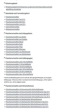 Es stehen insgesamt 30 Berichte für verschiedene Betriebstypen bereit. Dazu gehören drei Vermarktungsformen (Selbstvermarkter, Fassweinbetriebe und Mischbetriebe), acht Weinanbaugebiete, sechs verschiedene Größengruppen nach Rebfläche, biologisch versus konventionell arbeitende Betriebe, Weingüter mit und ohne Steillagen sowie bei ausreichend großer Stichprobe jeweils die drei Erfolgsgruppen der Topbetriebe, mittlerer und unterdurchschnittlicher Betriebe.