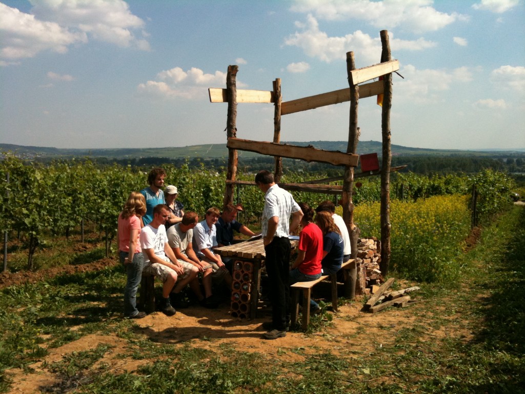 Mein Rundgang über den Campus führte mich zum Geisenheimer Fuchberg. Dort traf ich Prof. Dr. Randolf Kauer mit seiner Weinbau-Projketgruppe beim Bau eines beeindruckenden Lebensturms- inkl. einer kühlen Kellergrube. Inhalt?