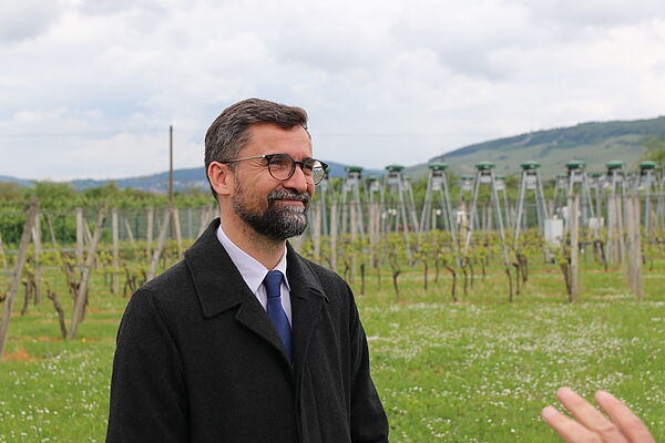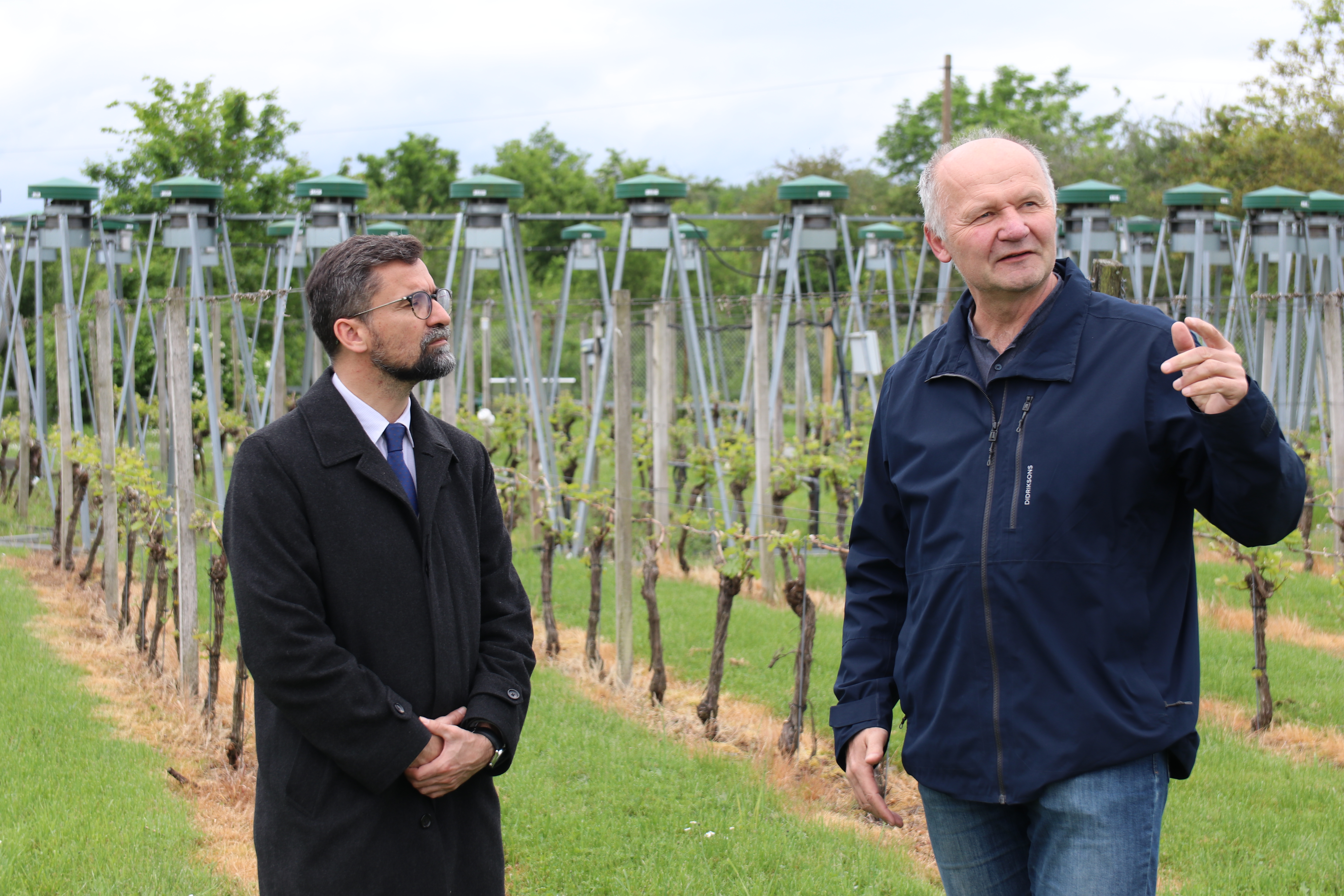 Im Anschluss an das Gespräch konnte sich Hr. Ortiz bei einem Campus-Rundgang mit Prof. Dr. Manfred Stoll, Leiter des Instituts für Weinbau und Oenologie an der Hochschule Geisenheim, einen Überblick über ausgewählte Forschungsprojekte im Weinbau. Unter anderem besichtigten die beiden das sogenannte „Free Air Carbon Dioxice Enrichment (FACE)“-Projekt der Hochschule sowie die Agri-Photovoltaik (APV). In den FACE-Anlagen war der Blick in Zukunft gerichtet, denn hier wird seit zehn Jahren die Auswirkung des Kohlendioxidanstiegs auf die Aktivität im Boden, die Physiologie und den Ertrag, die Interaktionen zwischen Pflanzen und Schaderregern sowie Veränderungen in den Inhaltsstoffen und der Produktqualität von Reben untersucht. Die Agri-Photovoltaik-Anlage begeisterte Herrn Ortiz durch die Möglichkeiten der doppelten Flächennutzung sowie der direkten Energieverwertung zum Schutz und zur Bewirtschaftung der Reben.