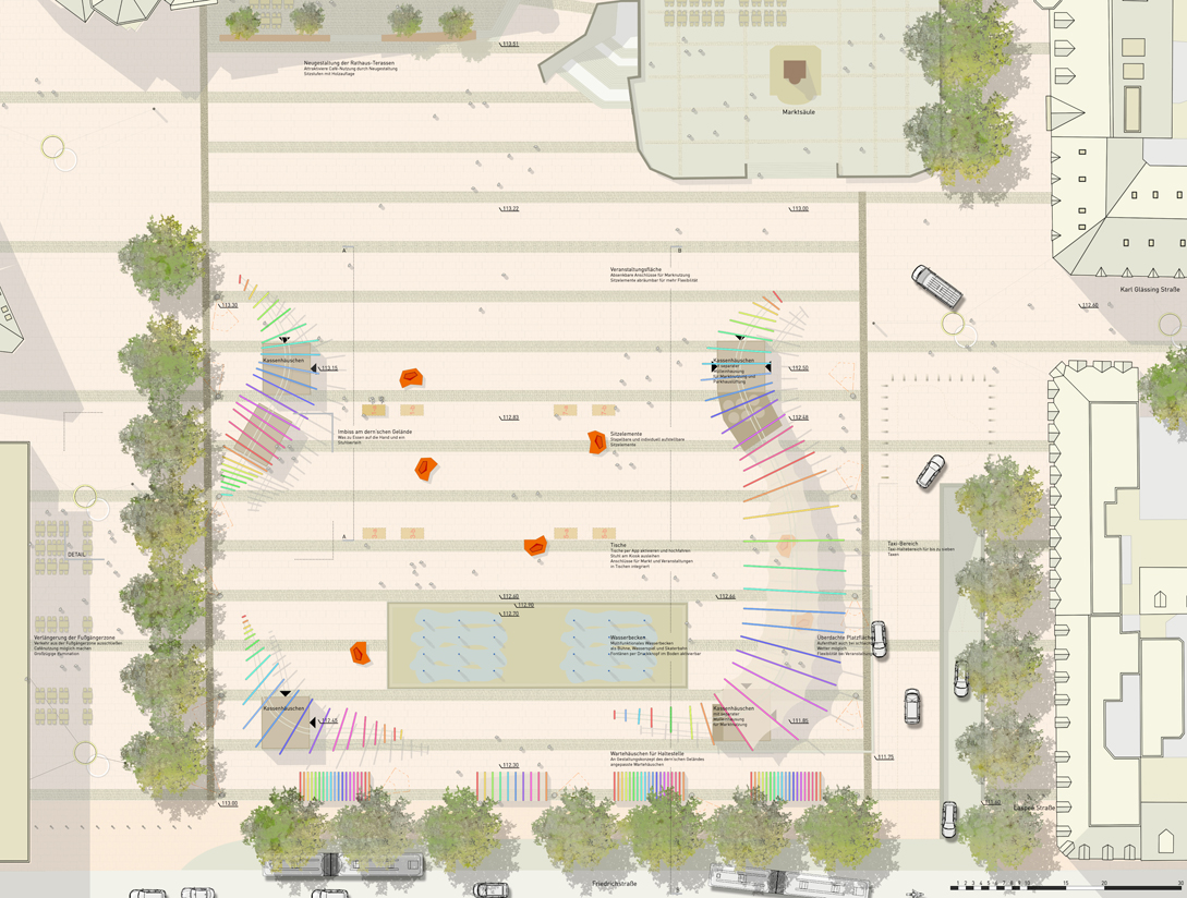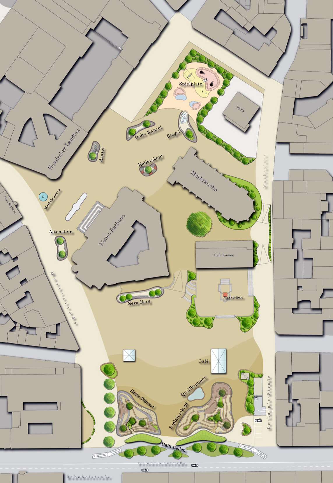 „Die Ideen der Studierenden zeigen, welches Potenzial dieser einzigartige Stadtraum im Zentrum von Wiesbaden birgt – sowohl hinsichtlich einer attraktiven landschaftsarchitektonischen Gestaltung als auch in Bezug auf seine Fähigkeit, auch jenseits der Marktzeiten viele Menschen zum Aufenthalt einzuladen und zu einem pulsierenden öffentlichen Raum zu werden“, so die betreuende Dozentin Petrow. „Die Diskussion um die Gestaltung des Dernschen Geländes dauert jetzt schon mehr als hundert Jahre und ist ein wichtiges Stück Stadtgeschichte“, ergänzt der kommissarische Direktor des Stadtmuseums Wiesbaden, Dr. Bernd Blisch, den historischen Hintergrund der Ausstellung.