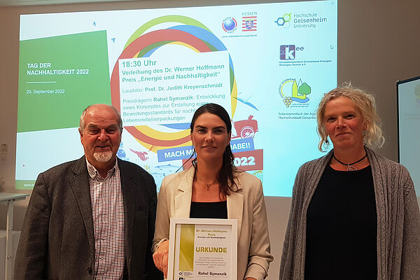 Für ihre herausragende Bachelor-Thesis „Entwicklung eines Konzepts zur Erstellung eines Bewertungsstandards für nachhaltige Lebensmittelverpackungen“ ist Rahel Symanzik, Absolventin des Studiengangs Logistik und Management Frischprodukte (B.Sc.) an der Hochschule Geisenheim, mit dem Dr. Werner-Hoffmann-Preis 2022 ausgezeichnet worden. Den mit 500 Euro dotierten Preis verliehen die Hochschule Geisenheim, die Lokale Agenda 21 Geisenheim und das Kompetenzzentrum Erneuerbare Energien Rheingau-Taunus-Kreis im Rahmen des 7. Hessischen Tages der Nachhaltigkeit am 29. September 2022.