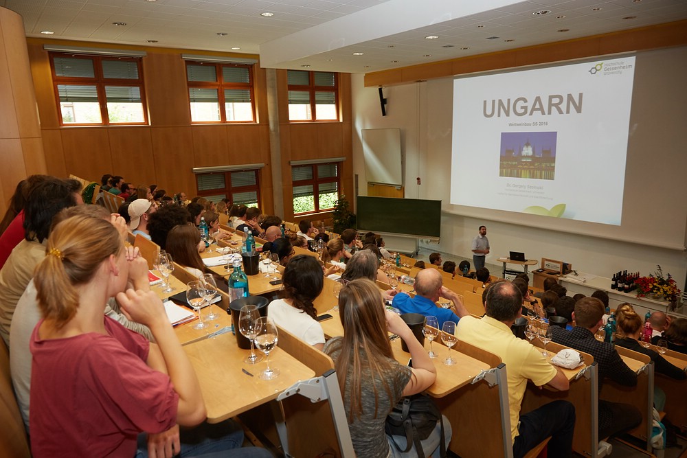 Über einhundert Studierende und externe Interessierte sowie drei Vertreter des Generalkonsulats von Ungarn in Düsseldorf: Die Vorstellung und Verkostung ungarischer Weine von Dr. Gergely Szolnoki im Modul Weltweinbau fand am vergangenen Mittwoch großen Anklang. Das Weinland Ungarn stellte Szolnoki, selbst gebürtiger Ungar, anhand von elf Weinen vor. „Es ist aber immer sehr zeitaufwändig, so viele ungarische Weine von Geisenheim aus zu organisieren“, sagt Szolnoki. Deshalb habe er sich über die Unterstützung vom ungarischen Agrarministerium und vom Generalkonsulat in Düsseldorf gefreut. „Die Verantwortlichen dort haben die gesamte Logistik übernommen. Das war eine riesige Hilfe“, betont Szolnoki.