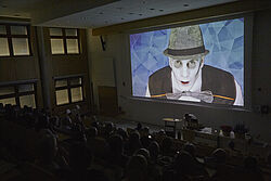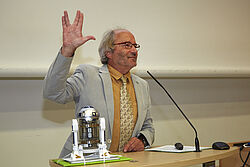 Großmann, ein bekennender Star Wars-Fan, freute sich sichtlich, als die beiden Musiker, die die Veranstaltung begleiteten, die Krieg der Sterne-Melodie spielten. Außerdem bekam er zu seiner Verabschiedung nicht nur vom Geisenheimer Bürgermeister zwei Originalfiguren aus den 70er Jahren, auch eine R2-D2-Kaffeemaschine mit den Worten „Rente gegangen, Manfred du bist“ (frei nach Meister Yoda) des Hochschulpräsidenten, Prof. Dr. Hans Reiner Schultz, rundet wohl jetzt seine Sammlung ab. Als Science-Fiction-Film-Fan ließ er es sich natürlich nicht nehmen, die Premiere seines letzten Projekts, den gemeinsam mit Prof. Dr. Andrea Gschwendtner von der Hochschule RheinMain entwickelten Wissenschaftsfilm „Abenteuer der Hefezellen“, anzukündigen. Es ist, wie er betonte, ein Sahnehäubchen, um das Interesse für Mikrobiologie zu wecken und Aktionen von Hefen zu zeigen, „denn Hefen sind Lebewesen und haben Bedürfnisse“.