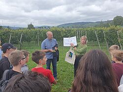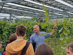 - Wie kann der Austausch von CO2 verringert und gleichzeitig der Weinanbau geschützt werden? Den Schüler:innen fielen die Unterschiede im Wachstum der Weinreben zwischen der Agri-Photovoltaik-Anlage und dem Kontrollfeld ganz deutlich auf.