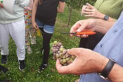- Wie wirkt sich der höhere CO2-Gehalt auf die Weinreben aus? Dazu besichtigten sie gemeinsam die Geisenheimer FACE Anlage und konnten mit Prof. Dr. Claudia Kammann und Prof. Dr. Manfred Stoll den Zustand der Reben und Trauben untersuchen.
