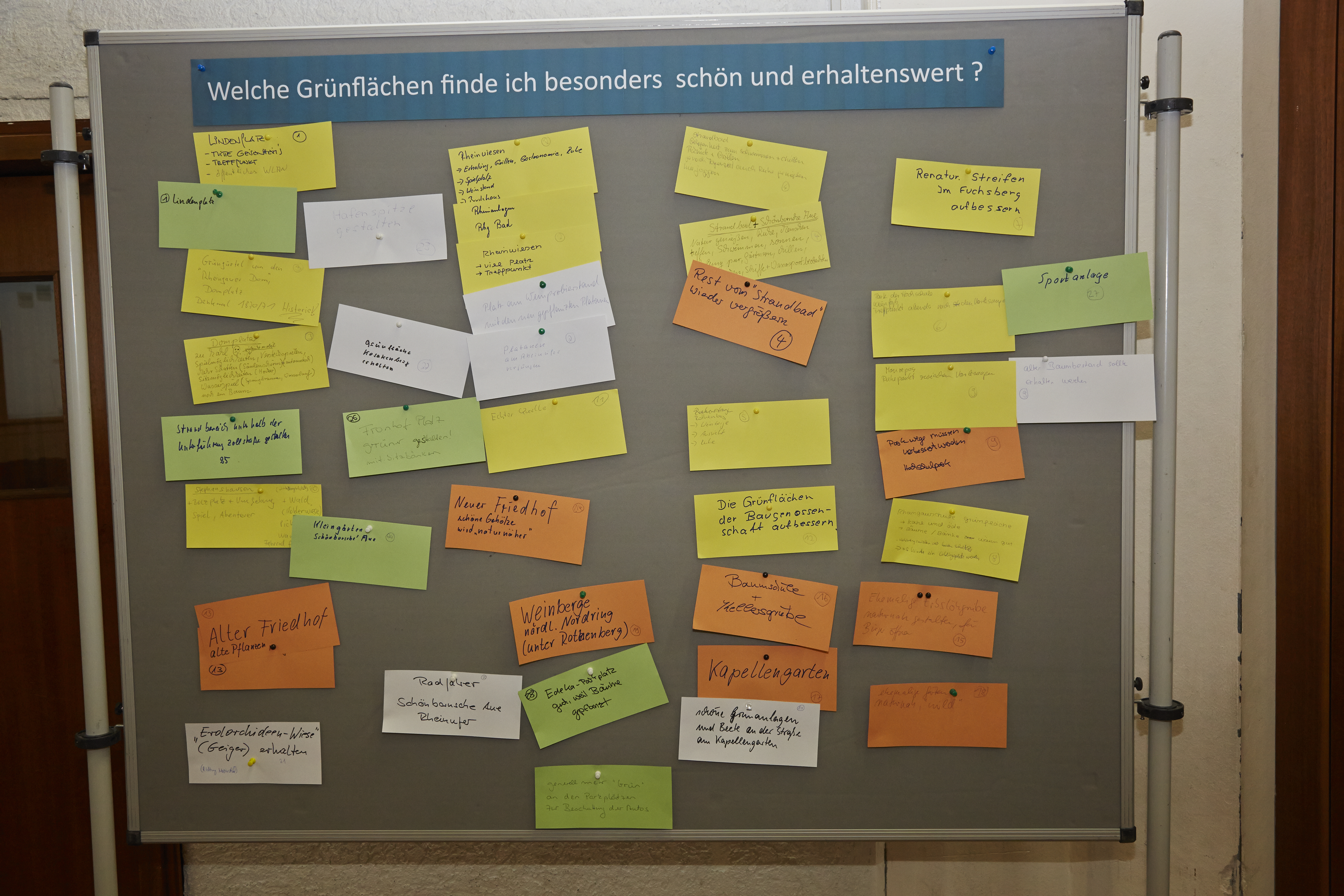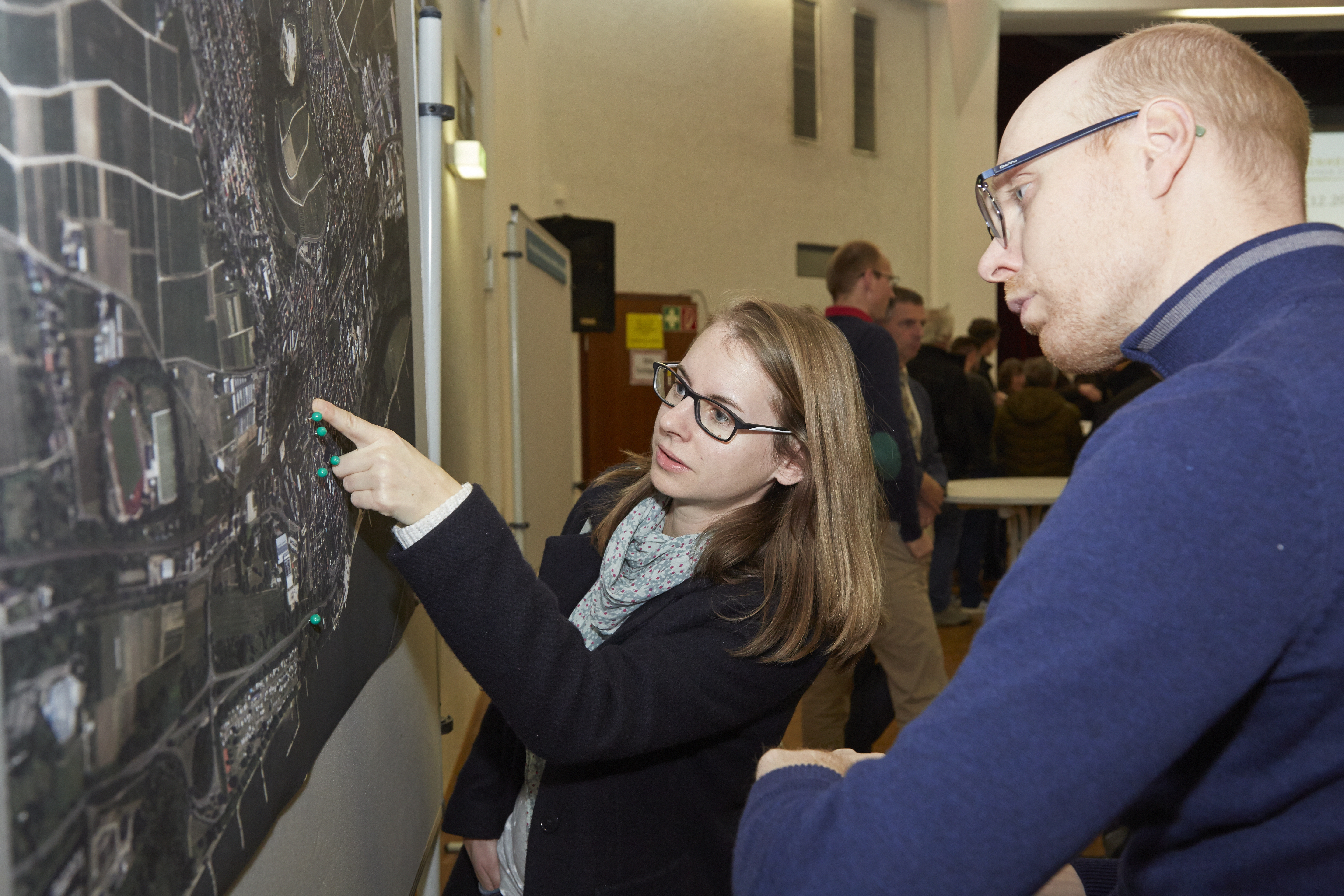 „Wie erlebe ich die Hochschule im Alltag?“, „Was bietet mir die Stadt Geisenheim?“ und „Wie stelle ich mir das Geisenheim der Zukunft vor?“ waren Fragestellungen, die in Kleingruppen aus unterschiedlichen Blickwinkeln und Interessenslagen erarbeitet wurden. Anhand von Luftbildern wurden die Fragen nach beliebten, aber auch nach entwicklungsbedürftigen Grünflächen erörtert und die Flächen mit Nadeln markiert. Es wurde auch aufgenommen, wie Grünflächen genutzt werden und wie man sie zukünftig nutzen möchte.