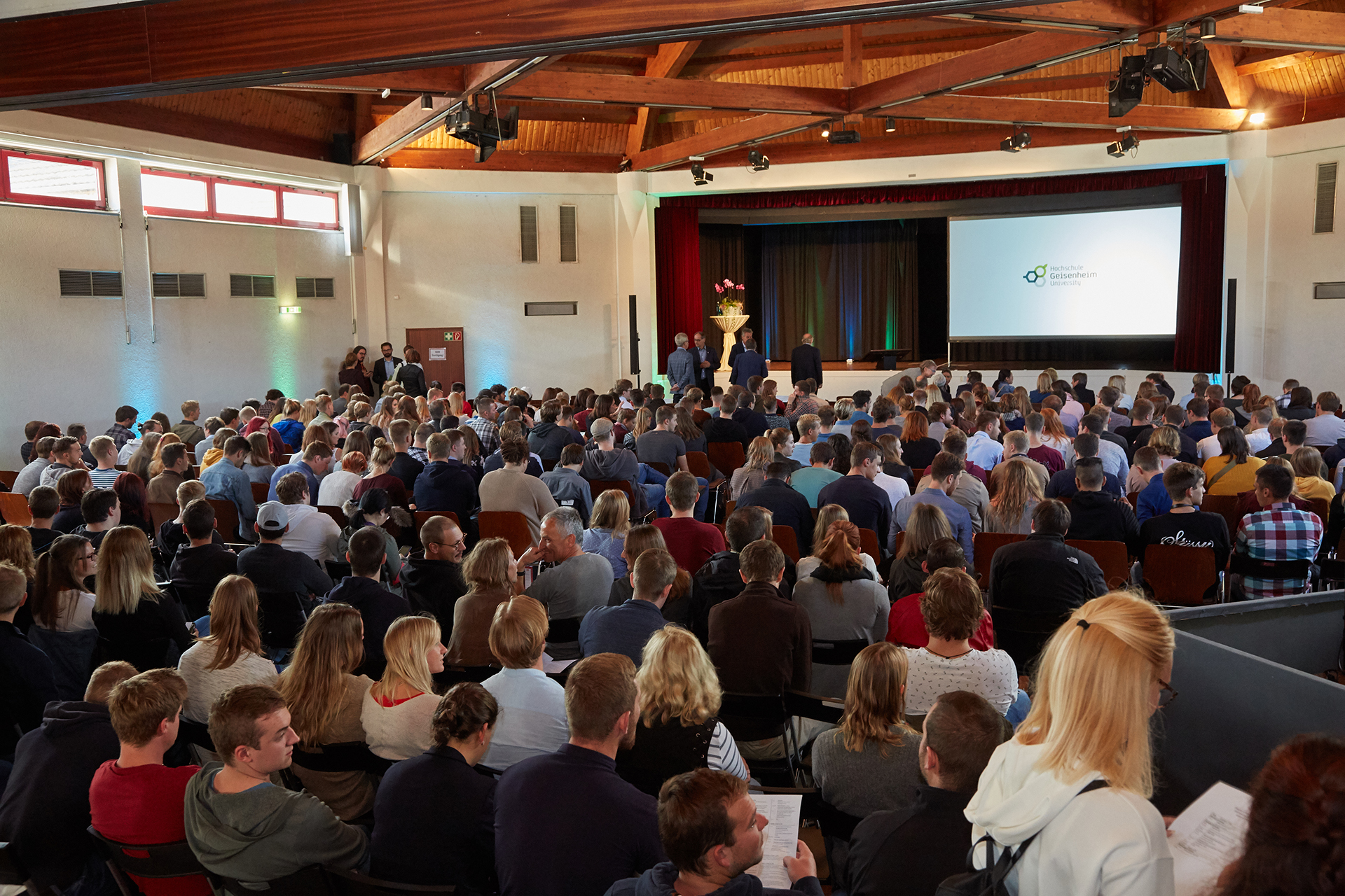 Viele neue und darunter doch einige aufgeregte Gesichter in der Hochschulstadt Geisenheim: Rund 360 neue Studierende fanden sich am Montag, 15. Oktober 2018, im Rheingau Atrium zur offiziellen Erstsemesterbegrüßung der Hochschule Geisenheim ein. Dort bereiteten ihnen das Präsidium, die Dozentinnen und Dozenten sowie Vertreter des Allgemeinen Studierendenausschusses (AStA) der Hochschule einen herzlichen Empfang. „Für uns sind Sie ab heute und nicht erst nach Ihrem Abschluss Geisenheimer“, betonte Prof. Dr. Otmar Löhnertz, Vizepräsident Lehre der Hochschule Geisenheim, in seiner Ansprache. „Das Besondere am Studium in Geisenheim ist die Praxisnähe. Wir werden Ihnen hier keine statischen Rezepte vermitteln, wir sorgen dafür, dass Sie Zusammenhänge verstehen und damit nach dem Abschluss in der Wirtschaft bestehen können.“