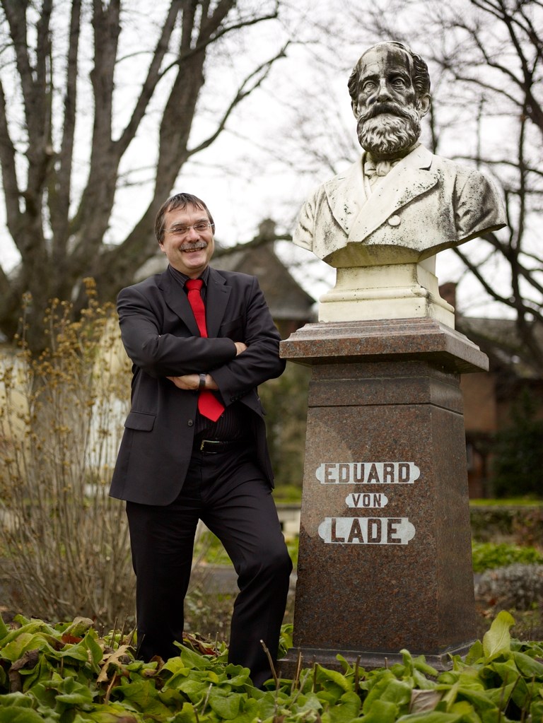 1861 erbaute er den Landsitz „Villa Monrepos“ mit ausgedehnten Parkanlagen in Geisenheim. Hier beschäftigte er sich mit der Züchtung und Kultivierung von Obst und Wein. Die Leitung seiner pomologischen Gärten lag zeitweise bei Hermann Goethe. 1872 wurde dank der langjährigen Bemühungen Eduard von Lades bei dem preußischen König Wilhelm I. sowie Reichskanzler Otto von Bismarck per Dekret die Königlich Preussische Lehranstalt für Obst- und Weinbau, die heute noch bestehende Forschungsanstalt für Garten- und Weinbau in Geisenheim gegründet. (s. Wikipedia)
