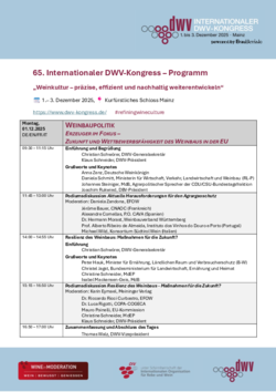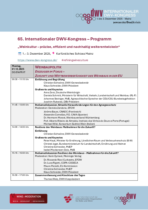 - 1. Dezember: Politischer Auftakt, der den Blick auf die Wettbewerbs- und Zukunftsfähigkeit des europäischen Weinbaus richtet – kostenfrei, aber mit Anmeldung über den Shop