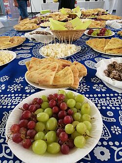 Zum Auftakt der Veranstaltung lobte der georgische Generalkonsul Giorgi Tabatadze die Zusammenarbeit zwischen Georgien und Deutschland und den Einsatz der Geisenheimer Studierenden. Für die extra Prise Immersion in das doch recht weit entfernte Land, gab es köstliche Kleinigkeiten aus der georgischen Küche. Denn neben der langen und lebhaften Weinkultur sind die Georgier und Georgierinnen über die Grenzen hinaus für ihre herausragende Küche und Gastfreundschaft bekannt. Der Nachmittag in der Aula der Hochschule Geisenheim war also in der Tat eine kleine Reise an den Rand Europas...