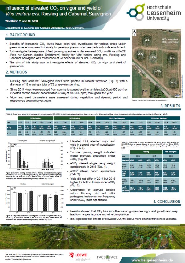 Mit ihrer Darstellung zum Einfluss einer erhöhten Kohlenstoffdioxid-Konzentration auf Wüchsigkeit und Ertrag von Vitis Vinifera cvs. Riesling und Cabernet Sauvignon haben Yvette Wohlfahrt, Doktorandin am Institut für allgemeinen und ökologischen Weinbau der Hochschule Geisenheim, und Institutsleiter Prof. Dr. Manfred Stoll den „Best Poster Award“ gewonnen. Die Preisverleihung fand am 16. Juni 2016 anlässlich des X. International Symposium on Grapevine Physiology and Biotechnology in Verona, Italien, statt.