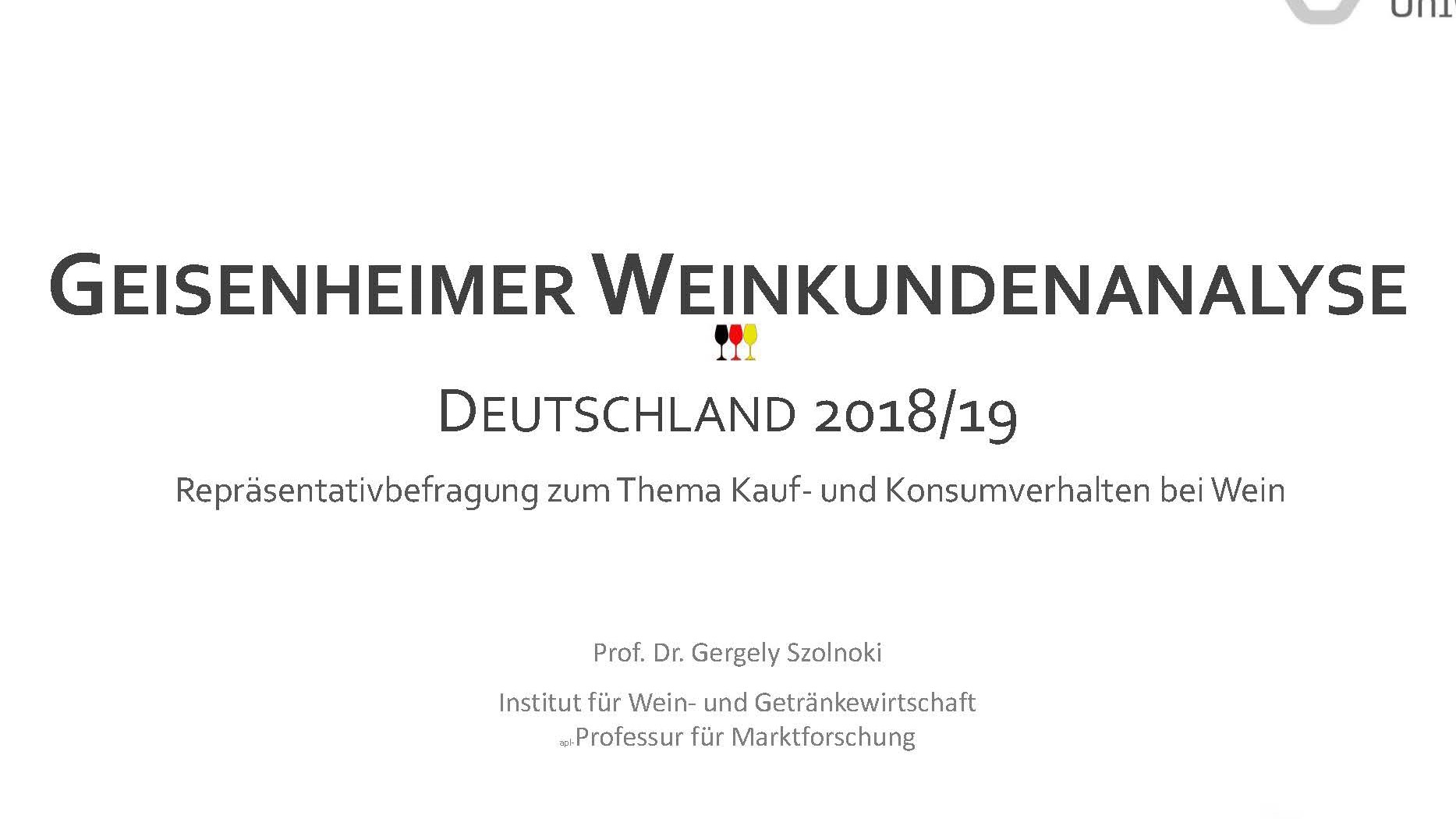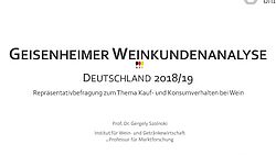 Das Institut für Wein-und Getränkewirtschaft der Hochschule Geisenheim beschäftigt sich intensiv mit „deutschen Weintrinkern“ und „dem deutschen Weinmarkt“. Um zuverlässige Daten zu diesen Themen zu sammeln, werden seit zwölf Jahren in regelmäßigen Abständen face-to-face Repräsentativbefragungen mit 2.000 Konsumenten durchgeführt. Die Ergebnisse der bisherigen Studien wurden in unterschiedlichster Form veröffentlicht: wissenschaftliche und praxisorientierte Artikel, Vorträge und Bücher. Ab diesem Jahr steht eine Zusammenfassung der 2018er Ergebnisse in Form eines 70-seitigen Endberichtes auf der Webseite. Das Institut für Wein-und Getränkewirtschaft stellt dies kostenlos zur Verfügung. Prof. Dr. Gergely Szolnoki, Verfasser des Dokuments, beschreibt den Bericht wie folgt: „Mit der Geisenheimer Weinkundenanalyse haben wir ein Instrument entwickelt, das aufgrund seiner Aktualität, Ausführlichkeit und Art der Ergebnisse einzigartig ist. Neben den Präferenzen und dem Kauf- und Konsumverhalten deutscher Weintrinker werden auch Fragestellungen wie Einkaufsstätten-Nutzung und wirtschaftliche Bedeutung von Untergruppen (Frauen vs. Männer, jüngere vs. ältere Generationen usw.) analysiert. Darüber hinaus werden auch spezielle Themen wie die Beliebtheit von Rebsorten, Gründe für die Ablehnung von Riesling, die Nutzung von Social Media Kanälen sowie die Charakterisierung von Weintrinkern und Nicht-Weintrinkern und Weintourismus untersucht.