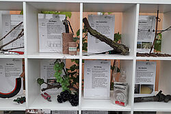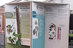 Interessierte konnten vor Ort die Weine aus dem Weingut der Hochschule verkosten und gleichzeitig das komplexe Jahr des Winzers komprimiert in einem Regal dargestellt betrachten. Sie brüteten über den Fragen des Weinquiz, um dann am Glücksrad drehen zu dürfen, oder verschafften sich einen Überblick über gängige Flaschenformen und Verschlussarten, die das Informationsangebot am Stand abrundeten.