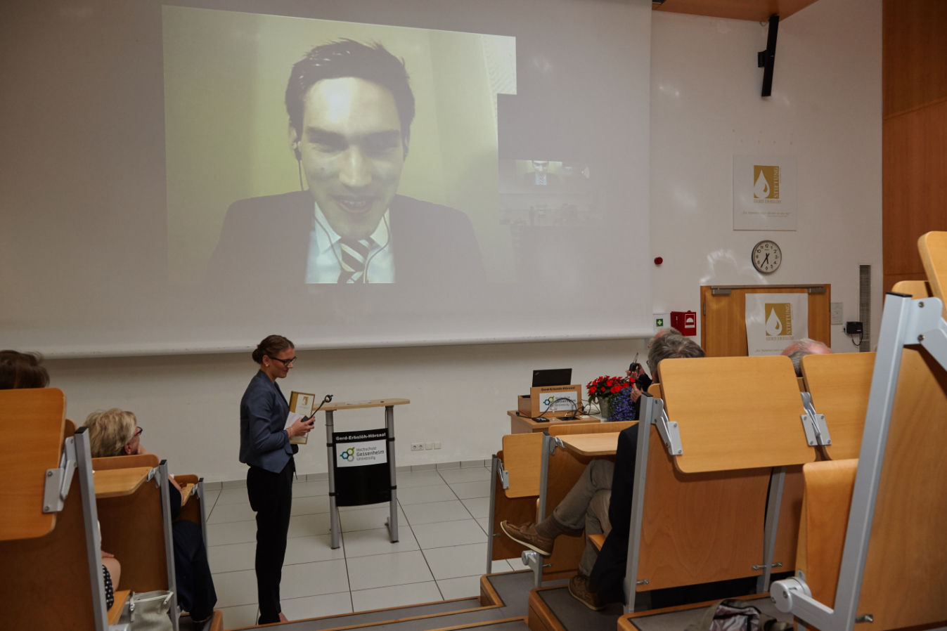 Die wichtigsten Personen an diesem Nachmittag sind aber die 3 Preisträger, die der Vorsitzende des Kuratoriums der Gerd-Erbslöh-Stiftung und frühere Direktor der Forschungsanstalt Geisenheim, Prof. Dr. Klaus Schaller, vorstellt.