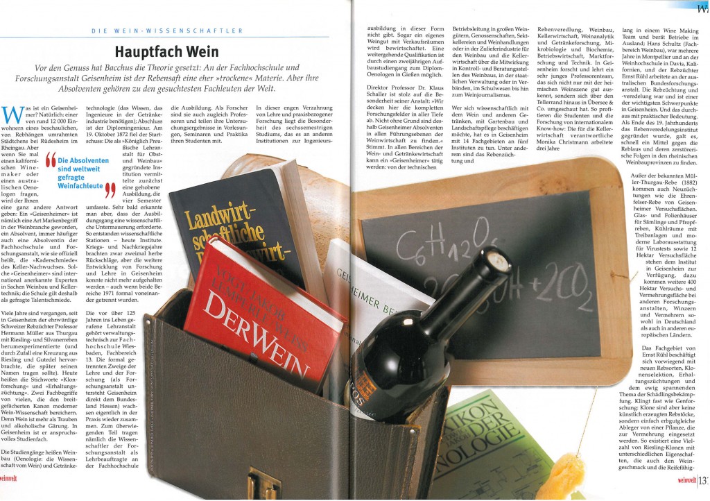 Bereits im Jahr 2001 verfasste die heutige Bundestagsabgeordnete Julia Klöckner einen Beitrag über die “ Kaderschmiede“ des Keller-Nachwuchs.“ Damals arbeitete Frau Klöckner für die Zeitschrift „WEINWELT“ des bekannten Meininger-Verlags in Neustadt. Der Artikel informiert unterhaltsam: „die Absolventen sind weltweit gefragte Weinfachleute“ und gibt einen tiefen Einblick in die Lehre und Forschung von Geisenheim. Sehr lesenswert!